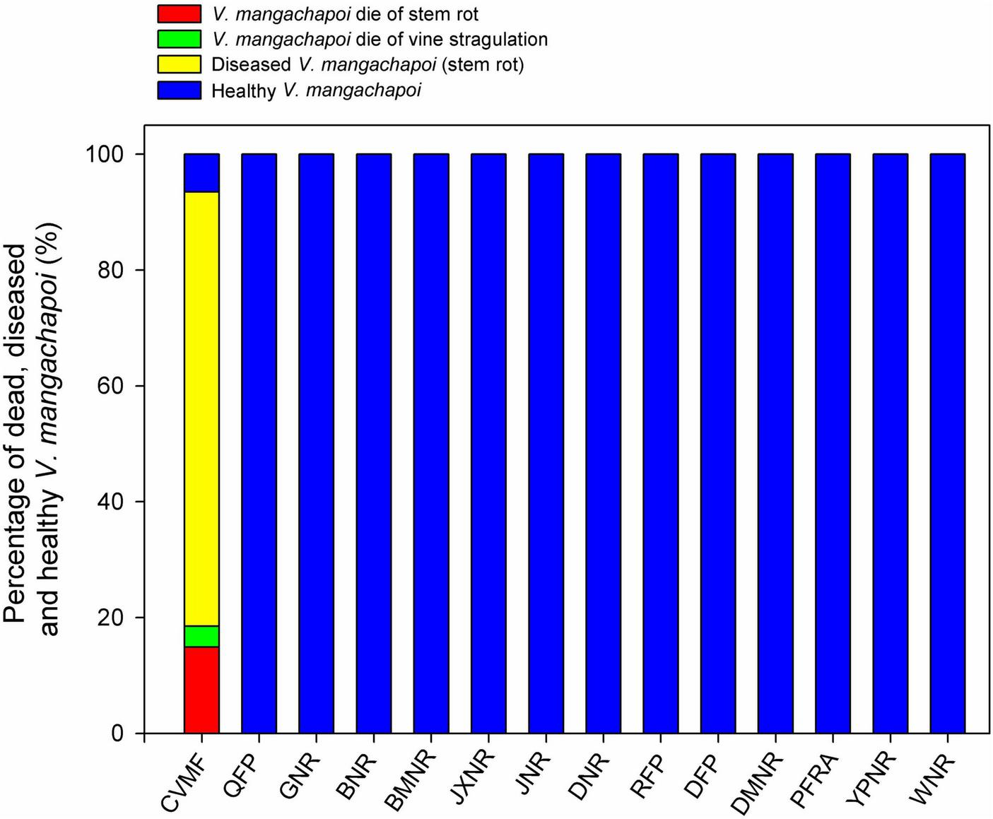 Composition of V. mangachapoi trees that are either infected (with stem rot), dead (due to stem rot or vine strangulation), or are healthy for Chinese V. mangachapi.
