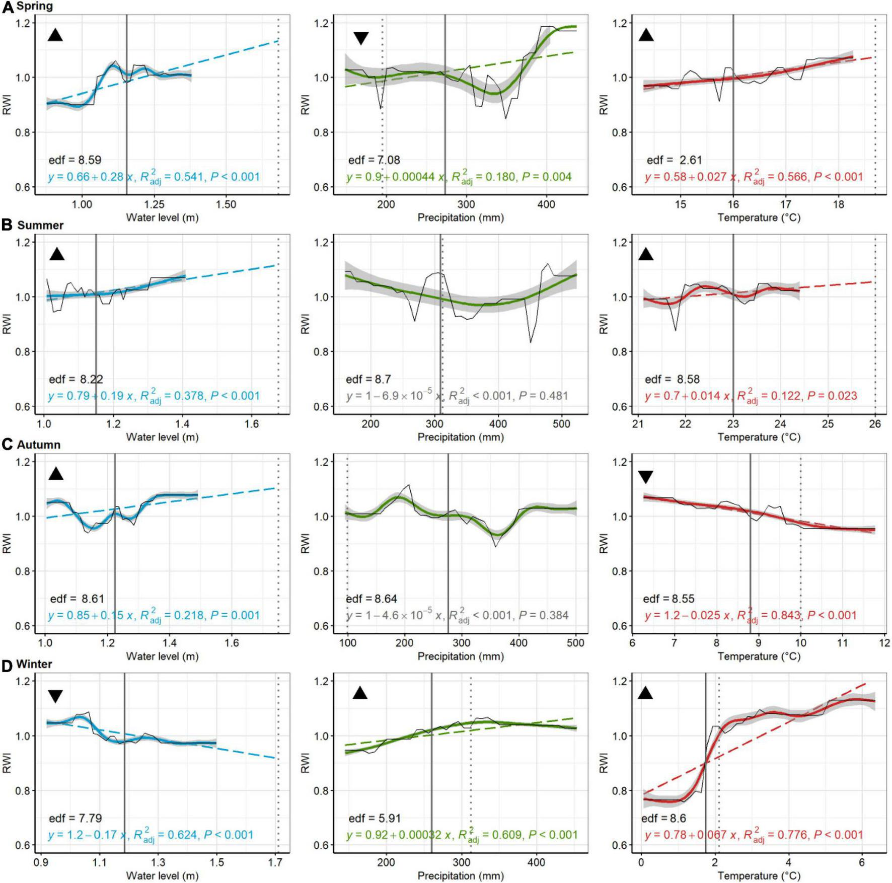 American holly, St Jones. Partial dependence plots of model-fitted RWI for seasonal [spring, (A); summer, (B); autumn, (C); and winter, (D)] water level, precipitation, and temperature. Black lines are means of cross-validated models (also see Supplementary Figure 4). Dashed trend lines are linear regressions shown when p < 0.05. Linear regression results, shown in color (in gray if p > 0.05), consist of the model equation, adjusted R2, and p-value. Curvilinear trends, with gray 95% confident boundaries, are fitted with a generalized additive model (GAM). GAM effective degrees of freedom (edf) are shown in black. Solid vertical lines are current means (1980–2019) for each environmental variable, whereas broken lines are the 2080 projected value for precipitation, temperature, and water levels. Triangular symbols in the upper left of each pane represent whether RWI trends for each seasonal parameter suggest more (upward triangle) or less (downward triangle) growth as the climate changes or sea levels rise. Panes without these symbols show which comparisons were inconclusive, based on lack of linear trends in growth or because the environmental parameter has minimal predicted change.