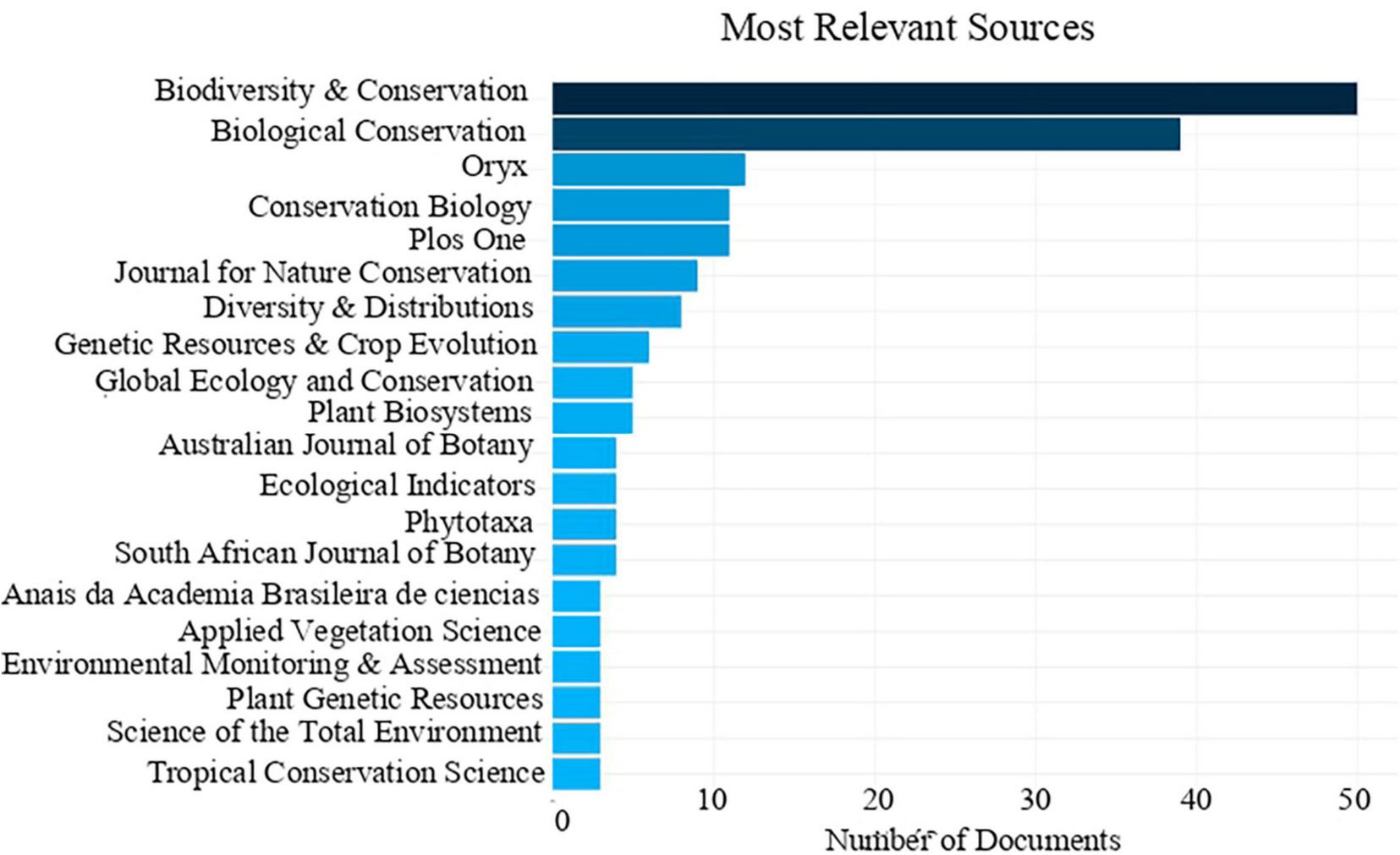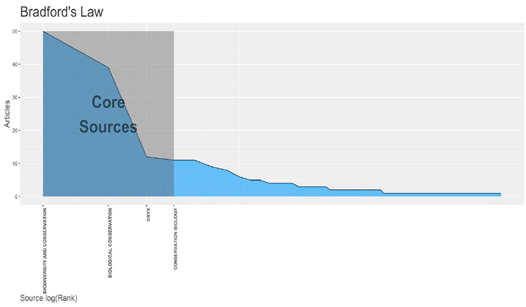 Of the 129 sources, the journal ‘Biodiversity and Conservation’ has been the most relevant and productive with 50 publications, followed by ‘Biological Conservation’ (39 publications), ‘Oryx’ (12 publications), ‘Conservation Biology’ and ‘Plos One’ (11 publications each), ‘Journal for Nature Conservation’ (9 publications), and ‘Diversity and Distributions’ (8 publications) (Figure 2). Based on Bradford’s law, of the total 129 sources, only four were found to be the core sources (Figure 3). Bradford’s law is a bibliometric principle that describes the relationship between journals and the articles published on a specific topic. It states that a small group of journals (known as core sources) contain a significant proportion of the articles related to a particular topic (Ridwan et al., 2023). Journals, Biodiversity and Conservation, Biological Conservation, Oryx, and Conservation Biology have been identified as the most important and basic sources for studies on threat assessments and conservation prioritization. These journals have published most number of articles on prioritization of conservation and thus are considered core journals for the topic. ‘Biodiversity and Conservation’ is an international journal that publishes articles on all aspects of biological diversity, its conservation, and sustainable use. On the other hand, ‘Biological Conservation’ is a leading international journal in the discipline of conservation science, publishing articles that contribute to the biological, sociological, ethical, and economic dimensions of conservation. Its primary aim is to publish high-quality papers that advance the science and practice of conservation or demonstrate the application of conservation principles and policy. Although the source dynamics analysis revealed that the journal ‘Biodiversity and Conservation’ remained the most relevant in terms of publications on threat assessments and prioritization for conservation up to the year 2013. But, since 2013, the number of relevant publications in ‘Biodiversity and Conservation’ has constantly decreased, and on the other hand, the number of relevant publications has increased in ‘Biological Conservation’ (Figure 4).