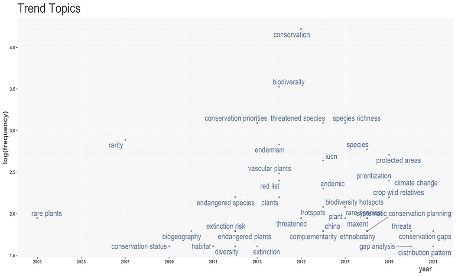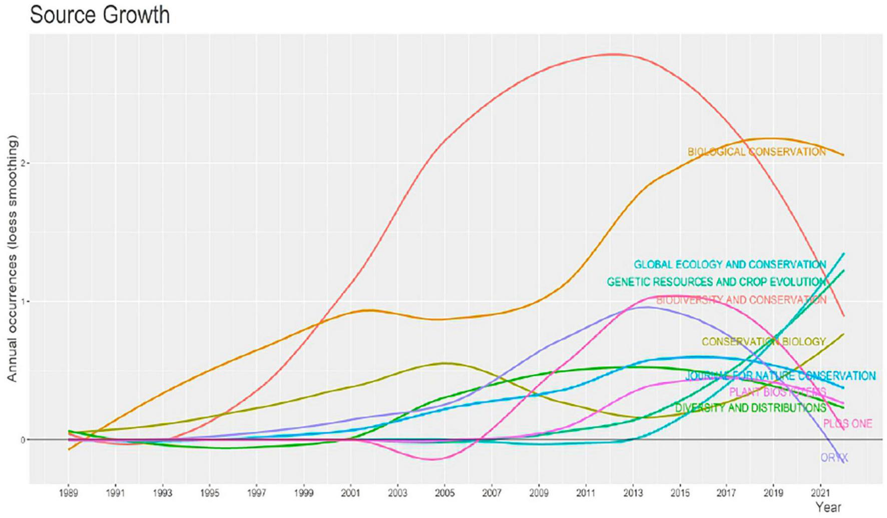 Bibliometric analysis studies have played a significant role in science and technology management and decision-making (Aleixandre-Benavent et al., 2018). Such studies are receiving considerable attention, as they provide valuable information on scientific research and its progression in a specific field of study (Aleixandre-Benavent et al., 2018). Several papers have been published employing bibliometric analysis techniques to evaluate a particular subject area or topic of research at qualitative and quantitative level: Tsunami research (Chiu and Ho, 2007; Jain et al., 2021; Suprapto et al., 2022); water research (Wang et al., 2010); biotechnology (Dalpe, 2002; Vain, 2007), deforestation (Aleixandre-Benavent et al., 2018); biodiversity loss (Tan et al., 2022); renewable energy (Rosokhata et al., 2021); ecotourism (Liu and Li, 2020; Khanra et al., 2021); climate change (Wang et al., 2014; Rana, 2020; Fu and Waltman, 2022); and COVID-19 research (Chahrour et al., 2020; Wang and Tian, 2021). In this paper, we perform a bibliometric analysis of published literature on threat assessment and prioritization of plants for conservation for the time period 1989–2022. Present study will add a new perspective to the current status and may help to identify hot spots in the field of global biodiversity conservation. More specifically, the article aims to identify the most relevant and productive sources, authors, institutions and countries, most cited authors, sources, institutions and countries, most influential articles, country collaborations and most frequently used keywords along with their growth trends from 1989–2022 in publications on threat assessment and prioritization for conservation. Present study will be useful to the researchers in determining which journals to target and how to identify potential research partners in the concerned field. Further, it will help researchers, managers, agencies and conservationists for planning better strategies to conserve and manage biodiversity.