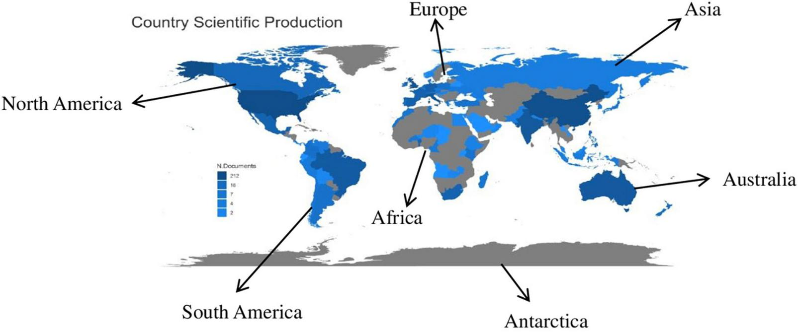 Most of the global biodiversity loss is concentrated in nine countries, viz., Australia, Brazil, China, Colombia, Ecuador, Indonesia, Malaysia, Mexico, and the USA (Mendoza-Ponce et al., 2020). This highlights the necessity for these nations to implement effective monitoring and policy enforcement for species conservation (Alroy, 2017). The present study reveals that most of these countries are working to implement effective monitoring and management policies for biodiversity conservation. Based on the country production analysis, it was revealed that authors from 76 countries have contributed to the field. The USA has the highest frequency of publications on threat assessment and prioritization for conservation (212 publications), followed by China (165 publications), the UK (106 publications), Italy (101 publications), India (79 publications), Australia (76 publications), Brazil (66 publications), Germany (46 publications), and Spain (44 publications) (Figure 5). In Himalayan Biodiversity Hotspot, China and India are the only countries to produce a significant number of publications in the relevant field. Other Himalayan countries like Pakistan and Nepal have produced 04 and 03 publications, respectively; whereas Bhutan has not produced any publication in the relevant field.