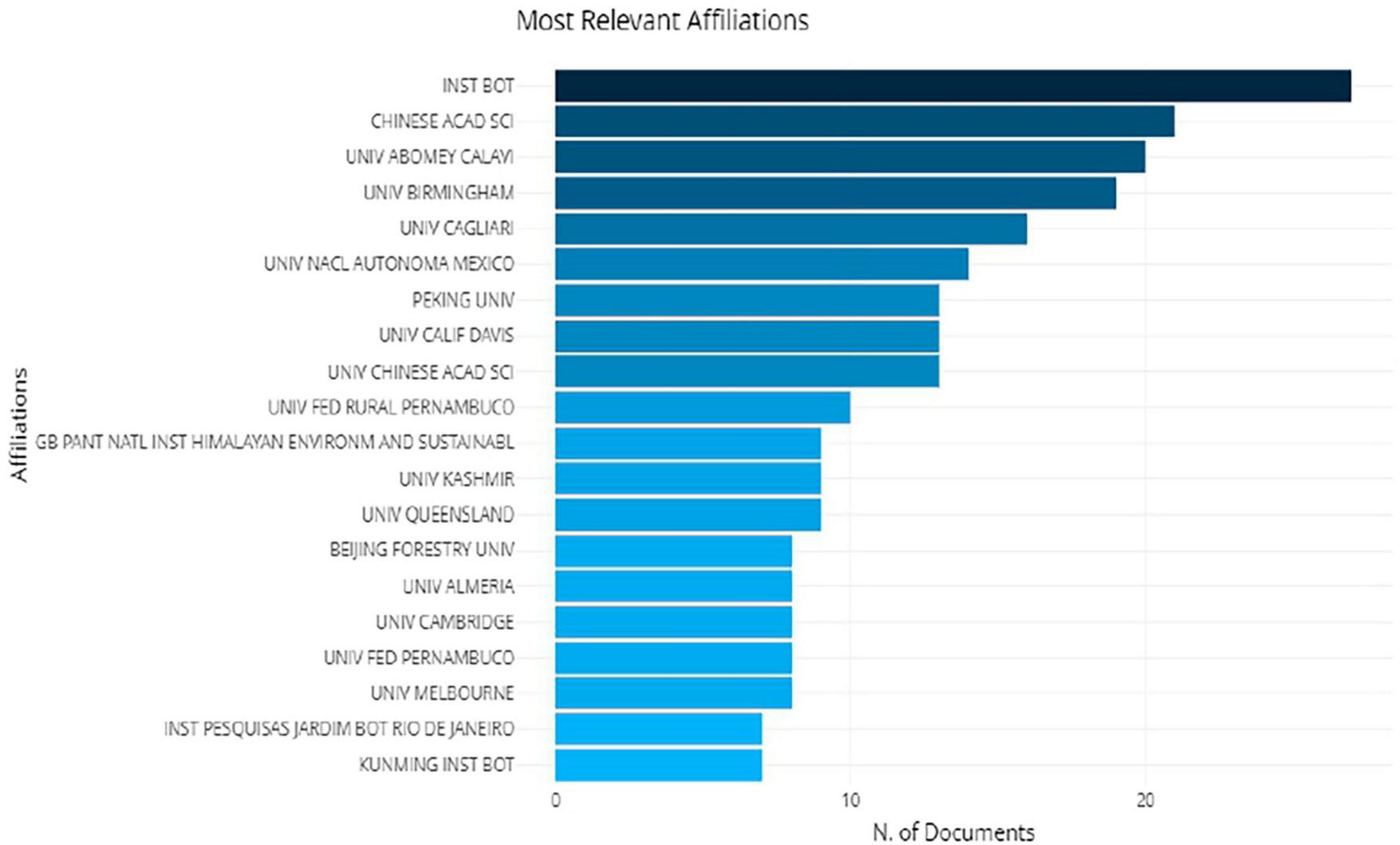 Collaboration analysis is another important science mapping procedure to reveal how contributors are linked to each other in a particular research field. It determines the pertinent contributors and their relationships (Aria and Cuccurullo, 2020). Of the total 315 documents, 28 are single-authored documents, and the average number of documents per author is 0.242. The average number of authors and co-authors per document is 4.13 and 4.86, respectively, with a collaboration index of 4.43. Countries with a Multiple Country Publications (MCP) rate ≥ 50% are the countries with high international cooperation in the field (Gulhan and Kurutkan, 2021). In the present study, Benin has the highest MCP with a rate of 71.4%, followed by the UK (62.5%) and France (37.5%). India has an MCP rate of only 4.76% (Table 4). Figure 7 depicts the country collaboration in threat assessment and prioritization for conservation studies, in which the blue color indicates the countries that have published the articles, and its intensity is proportional to the number of publications. The pink color line represents the connection between the countries, and its thickness depicts the level of collaboration. Collaboration is essential for conservation (Lloyd et al., 2023), as it will allow successful implementation of biodiversity conservation programs throughout the globe. Based on the most contributing institutes, the Institute of Botany has produced the maximum number of documents (27 publications), followed by the Chinese Academy of Sciences (21 publications), the University of Abomey-Calavi (20 publications), the University of Birmingham (19 publications), and the University of Cagliari (16 publications). Figure 8 shows the top twenty relevant affiliations of the corresponding authors with Institute of Botany, China, Chinese Academy of Sciences, China, University of Abomey-Calavi, Benin, and University of Birmingham, England as the most relevant affiliations.
