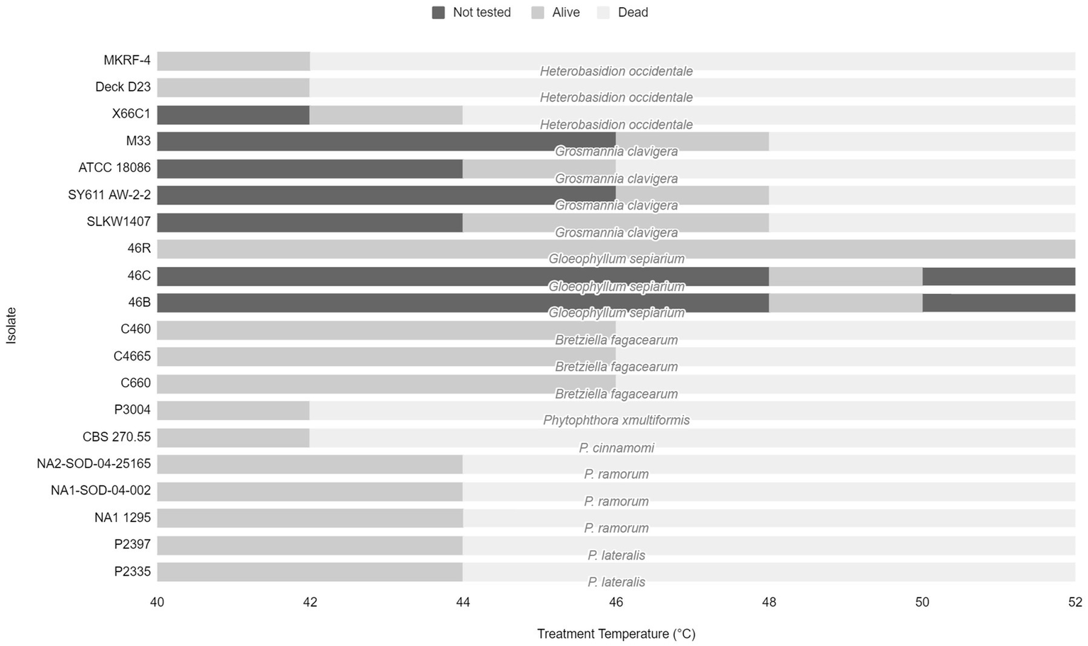 Range of treatment temperatures from 40 to 52°C tested for each fungal species and isolate to determine lethal temperatures. Dark gray bars represent temperature not tested. Light gray bars represent the treatment temperature that the pathogen survived. Pale gray bars represent the lethal temperature.