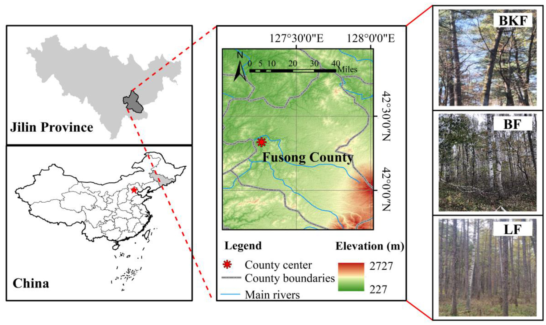 This study was conducted in Fusong County, Jilin Province in the northwest of Changbai Mountains (127°29′ to 128°02′E; 42°20′to 42°40′N; 600 to 800 m A. S. L., Figure 1). It is characterized by north temperate continental climate with prolonged and severe winters and hot and humid summer: long-term average annual precipitation recorded at the Baihe weather station ranged from 800 to 1,040 mm and the average annual temperature is 4.5–7.8°C. The forests are characterized by the original broad-leaved Korean pine forest and natural secondary forests regenerated after devastation with complex canopy, which is dominated by Pinus koraiensis, B. platyphylla, L. gmelinii, and Acer pictum. The soil is characterized as a mountain dark brown forest soil, and its average depth is about 50 cm (Deng et al., 2023b).