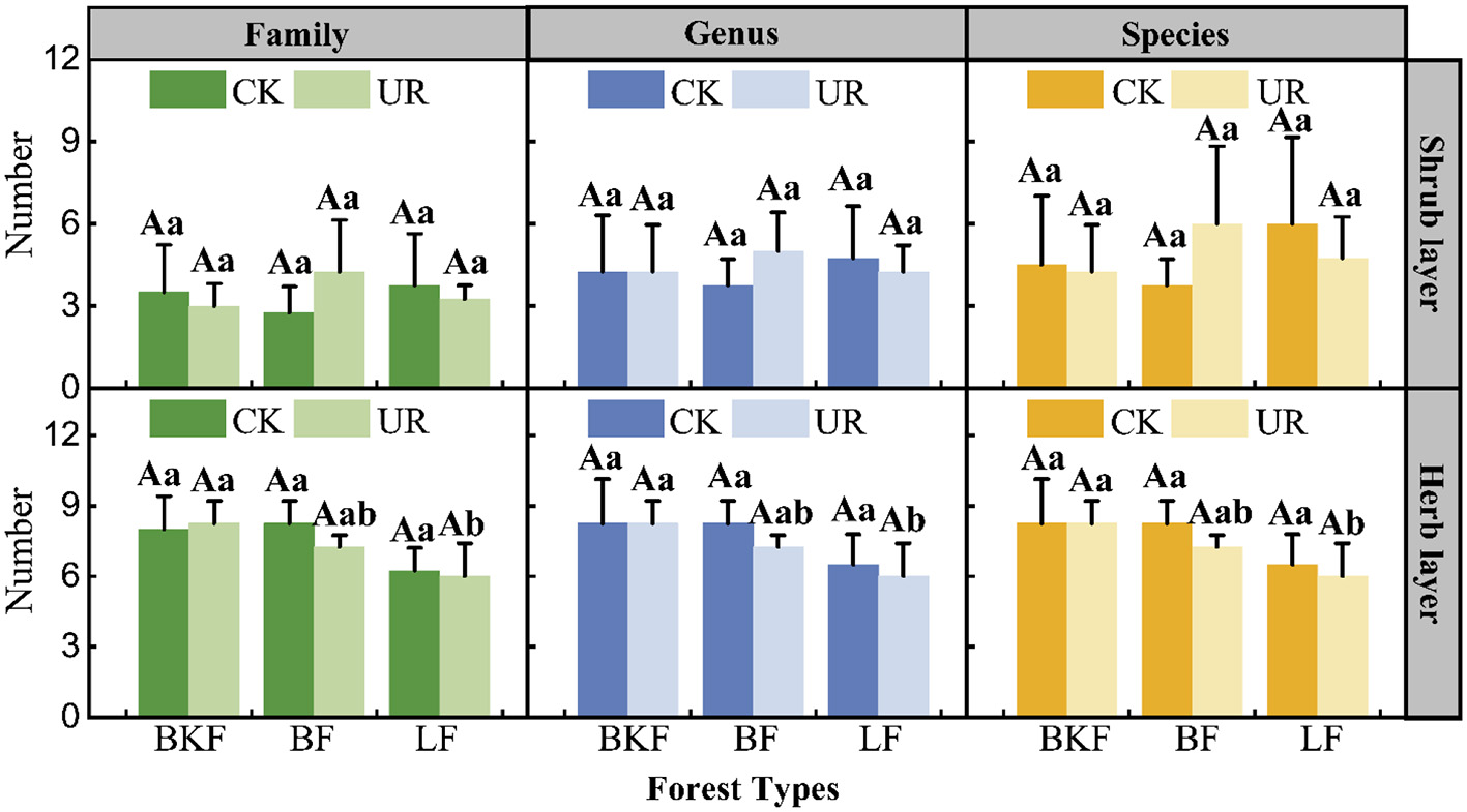 Changes in the number of families, genera, and species in understory left intact (CK) and removal (UR) stands. BKF, mixed broad-leaved Pinus koraiensis forest; BF, Betula platyphylla forest; LF, Larix gmelinii forest. Mean ± SD, n = 4. Different uppercase letters indicate significant differences between different understory managements in the same stands (P < 0.05), and different lowercase letters indicate significant differences among different forest types within a given understory management (P < 0.05).