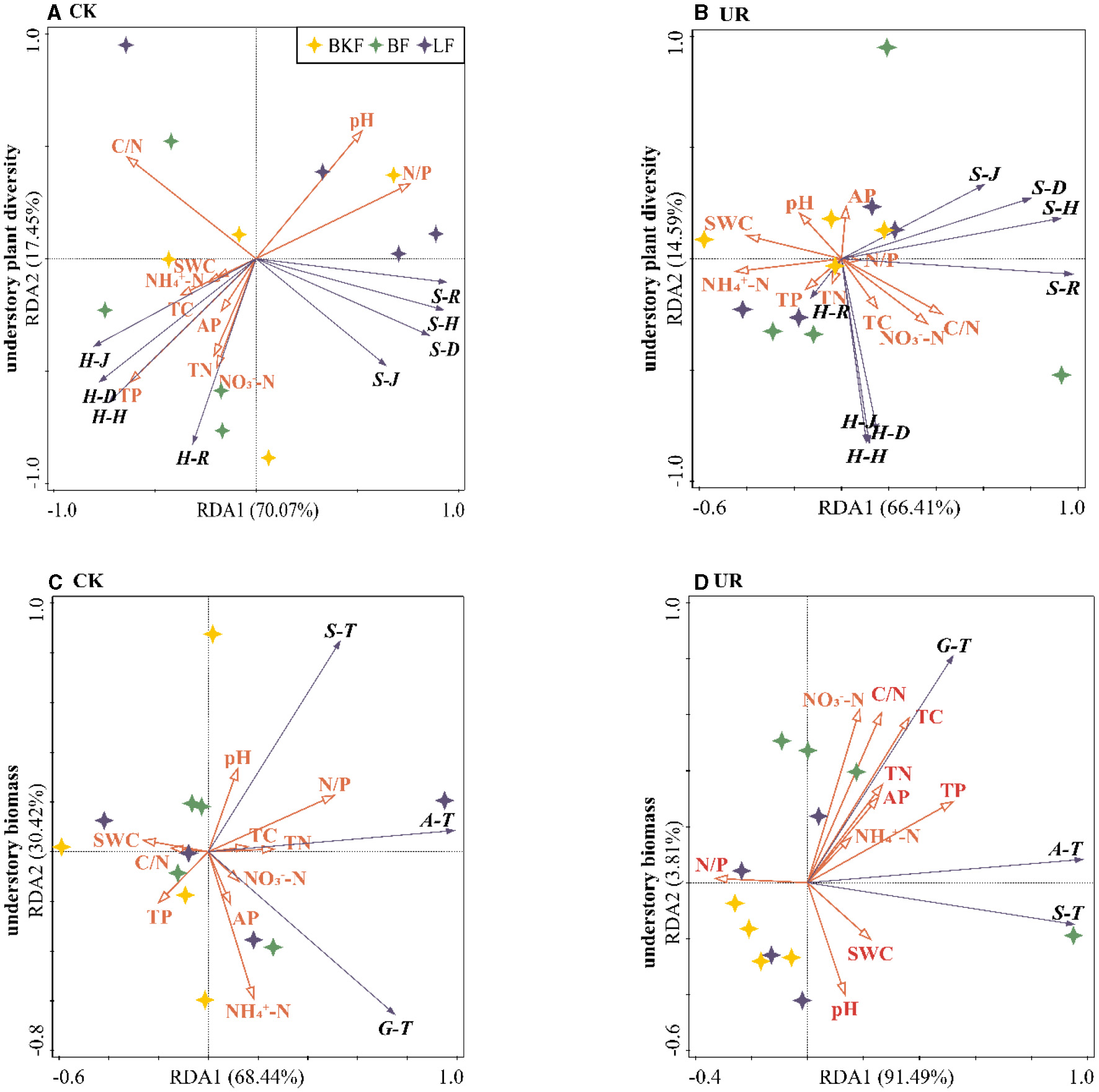 Redundancy analysis (RDA) for correlation between characteristics of understory vegetation and soil properties. (A, B) are redundant analyses of understory vegetation diversity and soil properties in understory left intact (CK) and removal (UR) stands, respectively; the first two axes explained 87.52% and 81% of understory plant diversity. (C, D) are the redundancy analysis of understory vegetation biomass and soil properties in understory removal and retaining stands, respectively, and the first two axes explained 98.96% and 95.3% of the understory biomass. S-R, S-H, S-D, and S-J and H-R, H-H, H-D, and H-J represent the Margalef richness index, the Shannon–Wiener diversity index, the Simpson dominance index and the Pielou evenness index of the shrub and herb layers, respectively. S-T, H-T, and A-T represent the shrub layer biomass, the herb layer biomass, and the total biomass of understory vegetation, respectively.