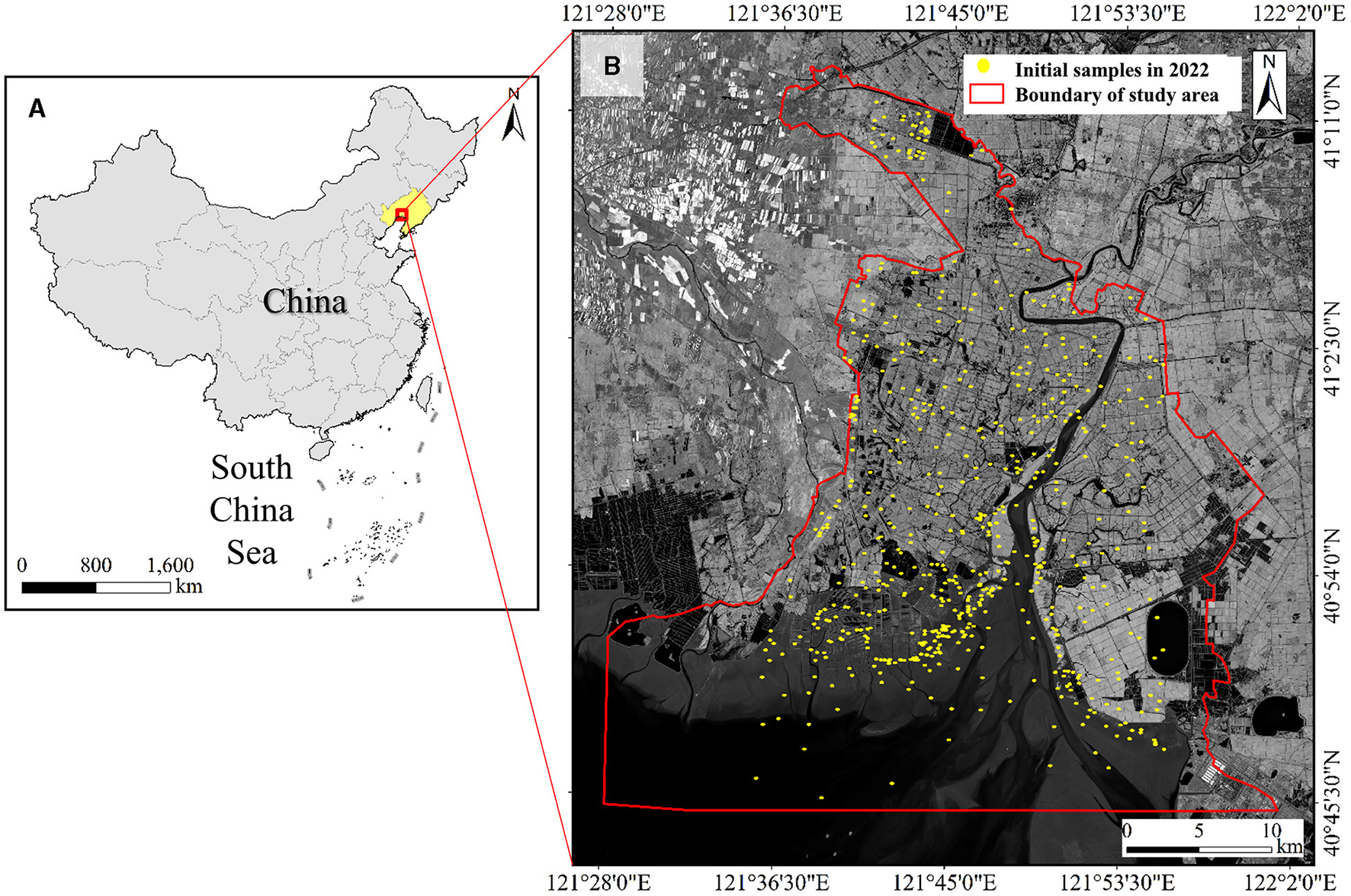 Figure 1. The location of the study area. (A) China, (B) Near-infrared (NIR) band of Sentinel-2 MSI.