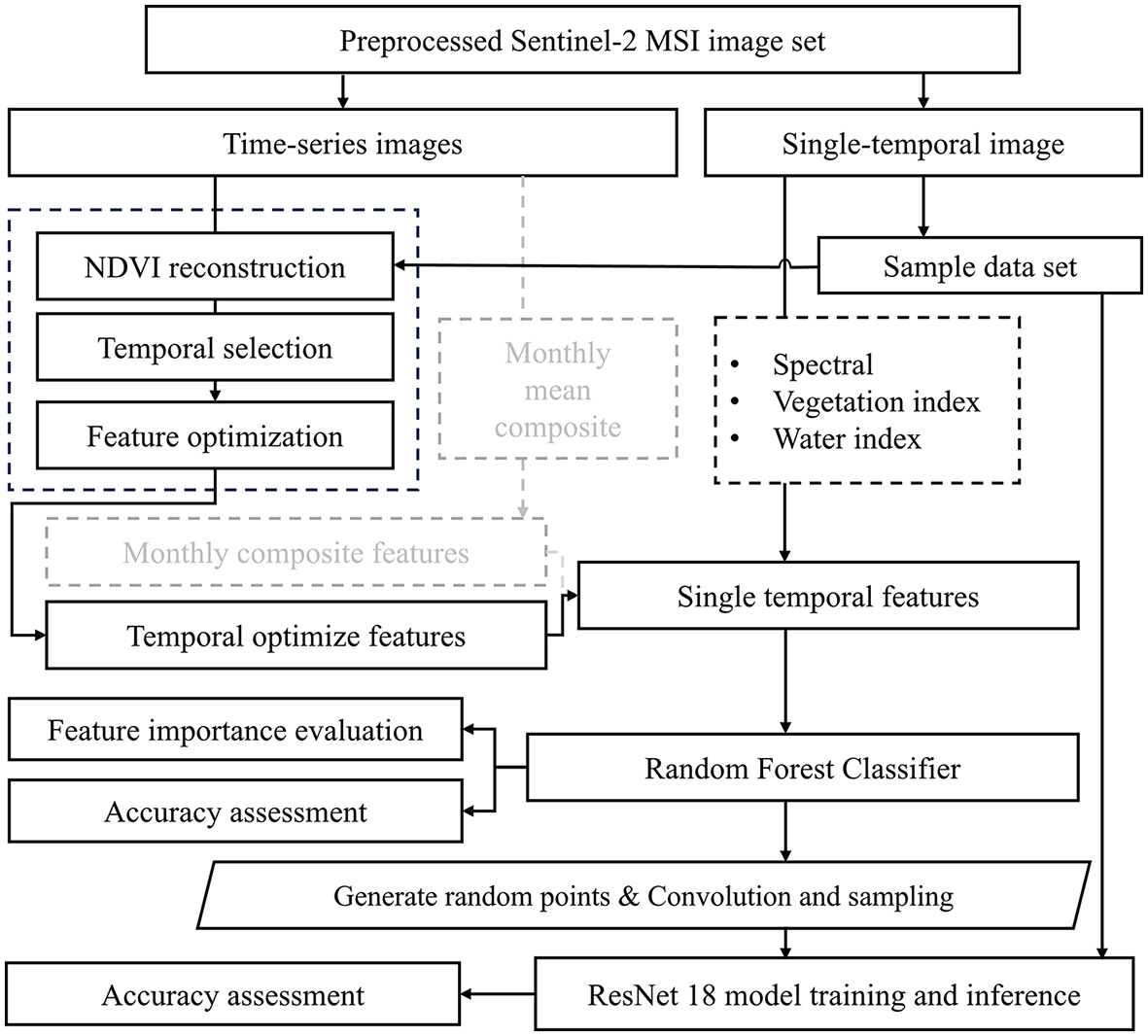 Figure 2. The research framework of this study. Dashed lines represent the control experimental group using monthly mean composite features.