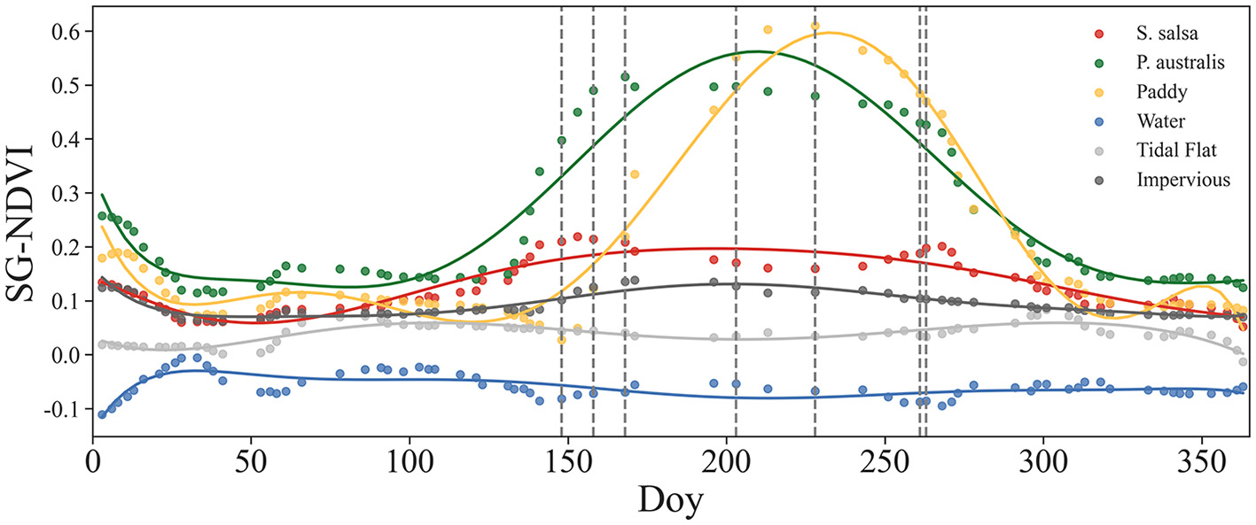 To capture the phenological changes in coastal wetlands, researchers have filtered or fitted time-series vegetation indices due to apparent annual variations in the growth state of salt marsh vegetation (Liu and Li, 2021). This study employed the Savitzky-Golay (S-G) filtering method for the time-series reconstruction of NDVI. The spatiotemporal scale of the data does not limit this algorithm and can capture local information anomalies, effectively removing noise from the time-series data (Schafer, 2011). The expression is shown as follows in Formula (1) (Wu and Wu, 2023).