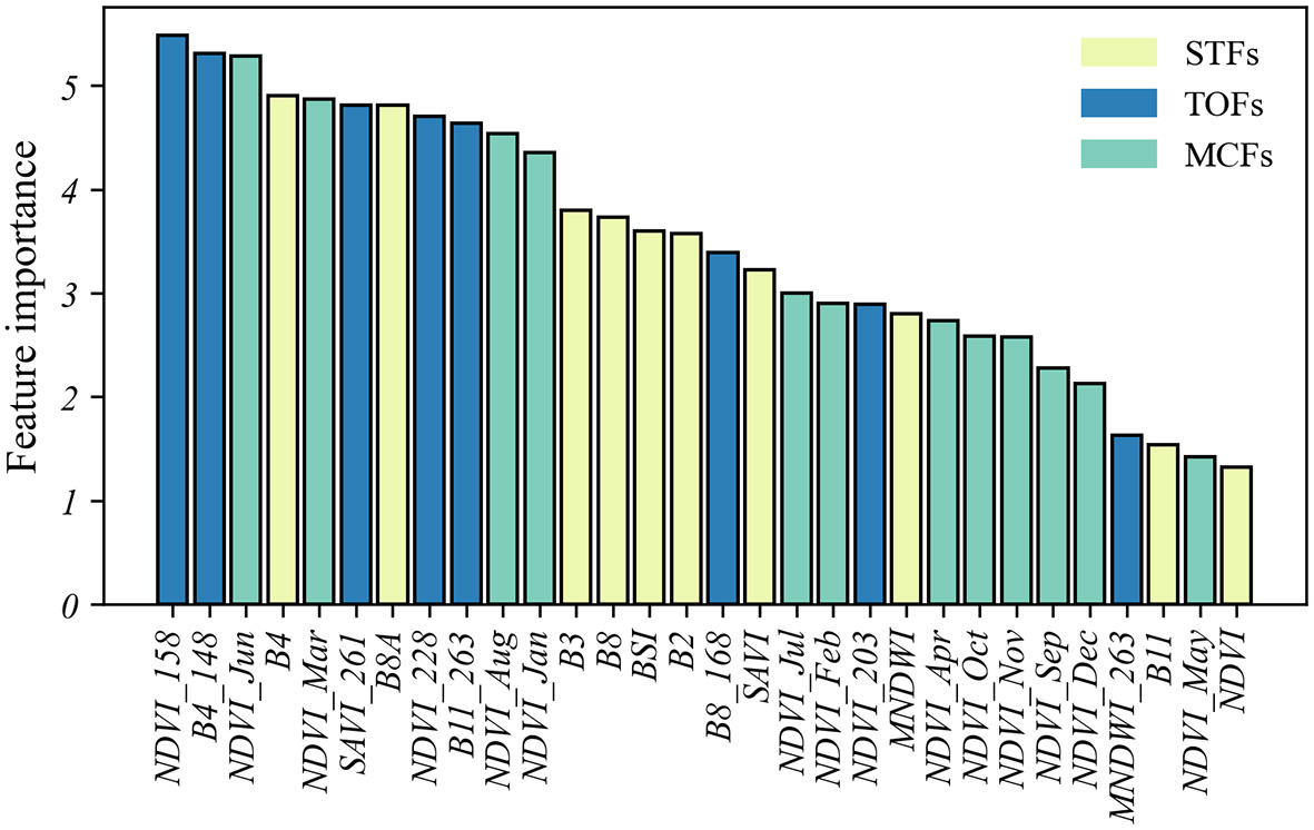 Figure 7 shows the ranking of the feature importance index, indicating that the accuracy of the RF model was enhanced by adding temporal information. Among the top 10 most important features, eight were temporal features, including five TOFs and three MCFs, along with two STFs, demonstrating the critical role of temporal information in model performance and the relative superiority of TOFs over MCFs and STFs. In the interval of the 10th to 20th most important features, STFs were predominant, with MCFs and TOFs each representing 2. Among the 10 least important features, MCFs constituted 6, while TOFs and STFs each comprised 2. Overall, the order of importance for the three types of features was TOFs > STFs > MCFs, and this ranking remained consistent across different model parameters (see S1 in Supplementary material).
