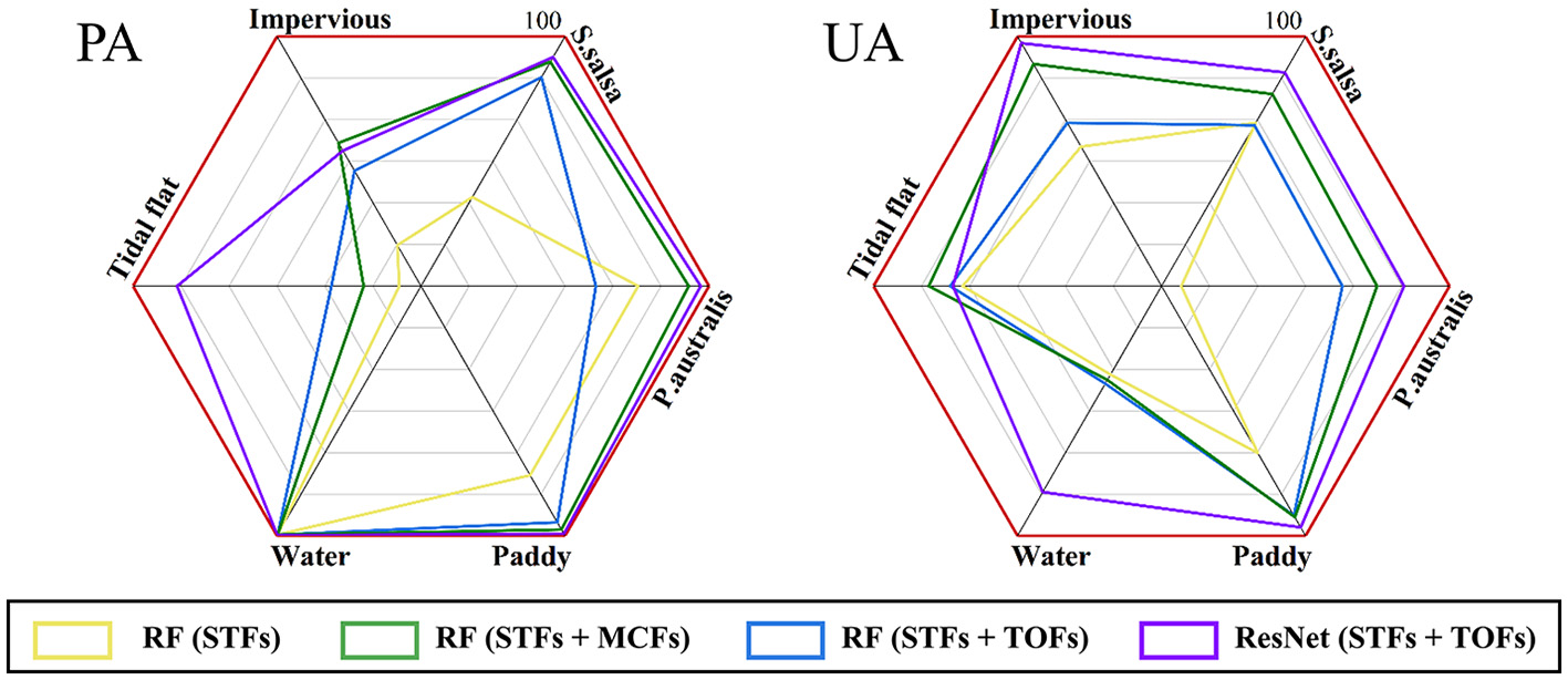 The results demonstrated that TOFs had evident advantages over STFs and MCFs in terms of feature importance and classification accuracy. This suggests that TOFs contain more crucial information and are more effective for accurately classifying the model. Specifically, including TOFs resulted in an 11.8% increase in the classification accuracy of the RF model and a 0.14 increase in the Kappa coefficient. In contrast, the improvements for MCFs were only 8.5% and 0.10, respectively. Moreover, using TOFs significantly improved the accuracy of specific land covers: the PA of S. salsa increased by 26.2%, and the UA of P. australis increased by 28.3%. The advantage of TOFs was evident in resolving the confusion in the transition areas between salt marsh vegetation and salt marsh vegetation to tidal flats, leading to more accurate classification results.