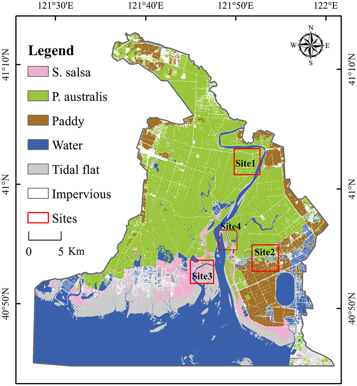 As the northernmost estuarine wetland in China, the Liaohe Estuary wetland preserves a typical and intact temperate coastal wetland ecosystem and estuarine landscape. Wetland vegetation, represented by S. salsa and P. australis communities, is widely distributed here, serving as a typical example of a secondary succession of plant communities in the northern plains of China's rivers. To decrease the impact of human activities on the ecosystem, the Liaohe Estuary Reserve (simply “LER” for short) has implemented strict restriction management and ecological restoration projects in recent years. It has also been incorporated into the national park creation zone, making the LER an ideal area for precisely mapping coastal wetlands and assessing ecological restoration effects.