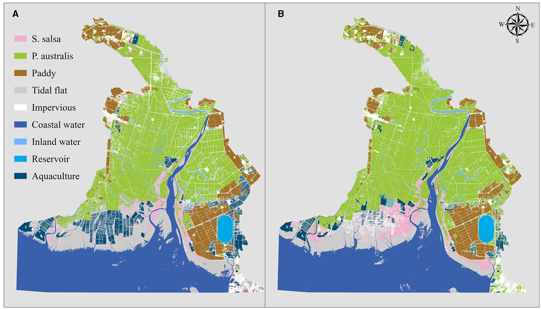 This study quantified the scale and sources of salt marsh vegetation ecological restoration using a land use transition matrix, distinguishing restoration into natural and artificial. Natural restoration was defined as converting natural land cover types to salt marsh vegetation, encompassing S. salsa, P. australis, tidal flat, inland water, and coastal water. Artificial restoration referred to converting artificial land use types to salt marsh vegetation, including paddies, reservoirs, aquaculture ponds, and impervious. This study evaluated the scale and direction of ecological restoration, clarified the relative contributions of natural regeneration and artificial restoration, and provided critical data support for formulating ecological restoration strategies.
