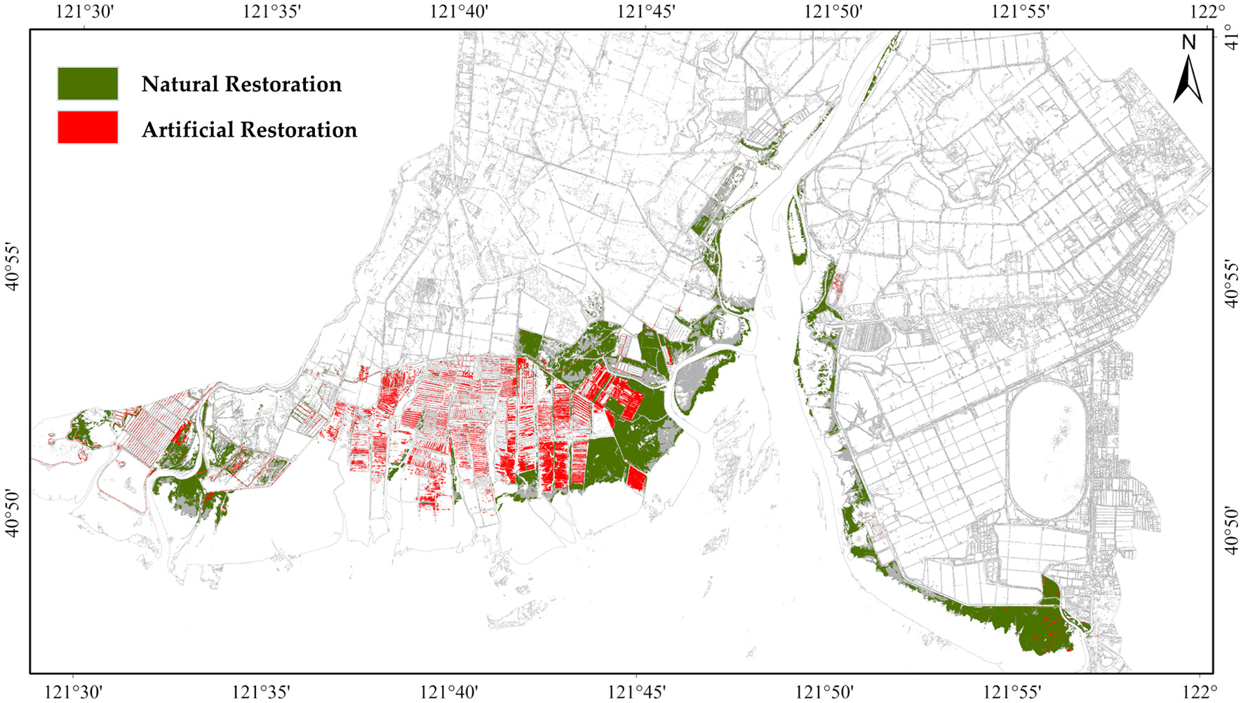 Figure 12. Spatial distribution of S. salsa restoration. Red indicates restored S. salsa converted from human land use, i.e., artificial Restoration; green represents restored S. salsa converted from natural wetlands, i.e., natural restoration.