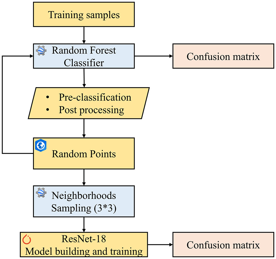 To obtain sufficient samples for comprehensive training of the deep learning model, this study expanded the initial samples by referring to the method described by Wang M. et al. (2023). Specifically, the study area's remote sensing images were pre-classified using the initial samples and the RF algorithm. The classification results were then converted into vector data for manual review and modification, obtaining different land class vector patches within the study area. Based on the spatial extent of the vector patches, 3,000 samples were randomly generated for each land class, ensuring the balance and representativeness of the sample data during the training of the deep learning model. All initial and expanded sample points were merged and divided into training and validation samples at a 7:3 ratio. These samples were used to train and validate the ResNet and RF models based on different feature combinations.