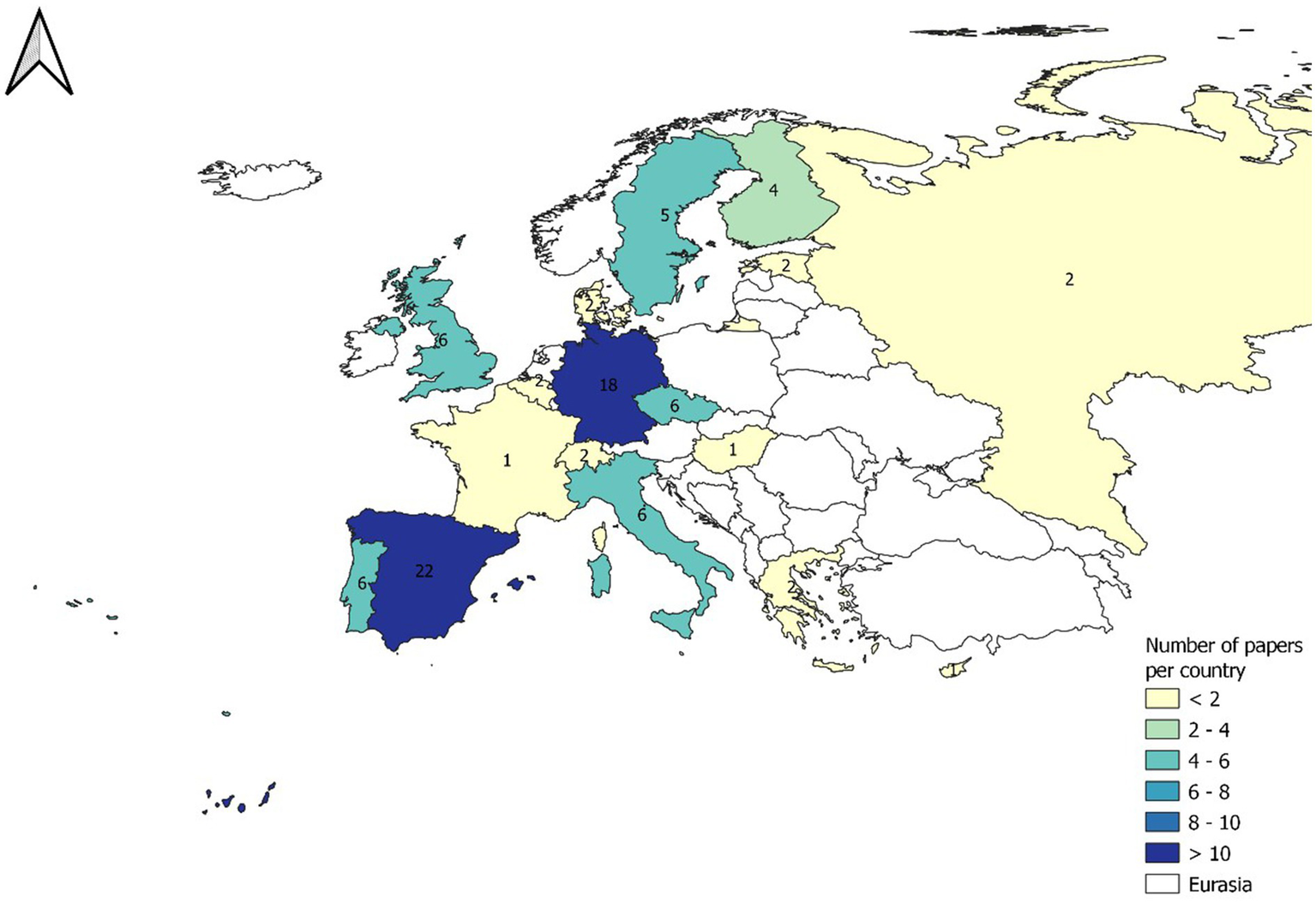 The set of relevant papers selected were examined further to extract information about the restoration projects, detailed attributes such as country in which the projects were carried out, year of implementation, study period, ecological or socioeconomic aspects analyzed and indicators used to measure the outcome of the restoration. Figure 1 provides a comprehensive overview of the distribution of selected European restoration papers. This figure also includes two studies carried out in Russia in close proximity to the European border. Certain studies were not included in Figure 1 because they embrace more than one country. These studies were undertaken in: (i) The Mediterranean area, (ii) Worldwide, (iii) Portugal and France, (iv) USA and Spain, and (v) Netherlands, Germany, Norway, UK, Sweden and France.