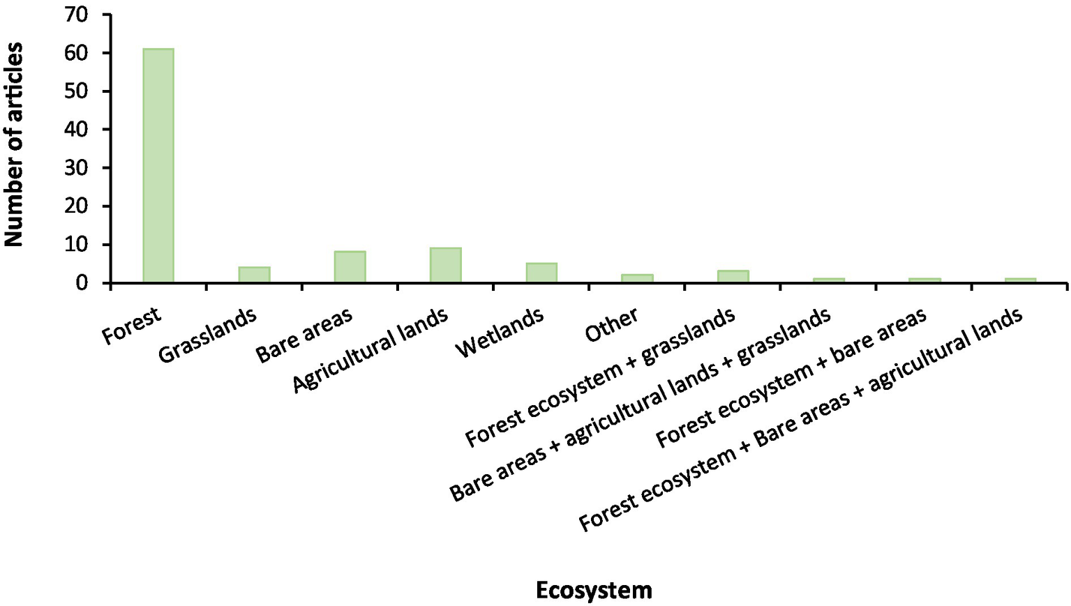 The most frequently studied pre-restoration land cover was Forest (61), followed at a considerable distance by Agricultural lands (9) or Bare areas (8), whereas the other pre-restoration land covers were more sparsely represented (Figure 3). The analysis revealed that in some cases the studies were undertaken in more than one pre-restoration land cover. In this regard, four types of pre-restoration land cover combinations were observed: (i) Forest + Grasslands, (ii) Bare areas + Agricultural lands + Grasslands, (iii) Forest + Bare areas, and (iv) Forest + Bare areas + Agricultural lands.
