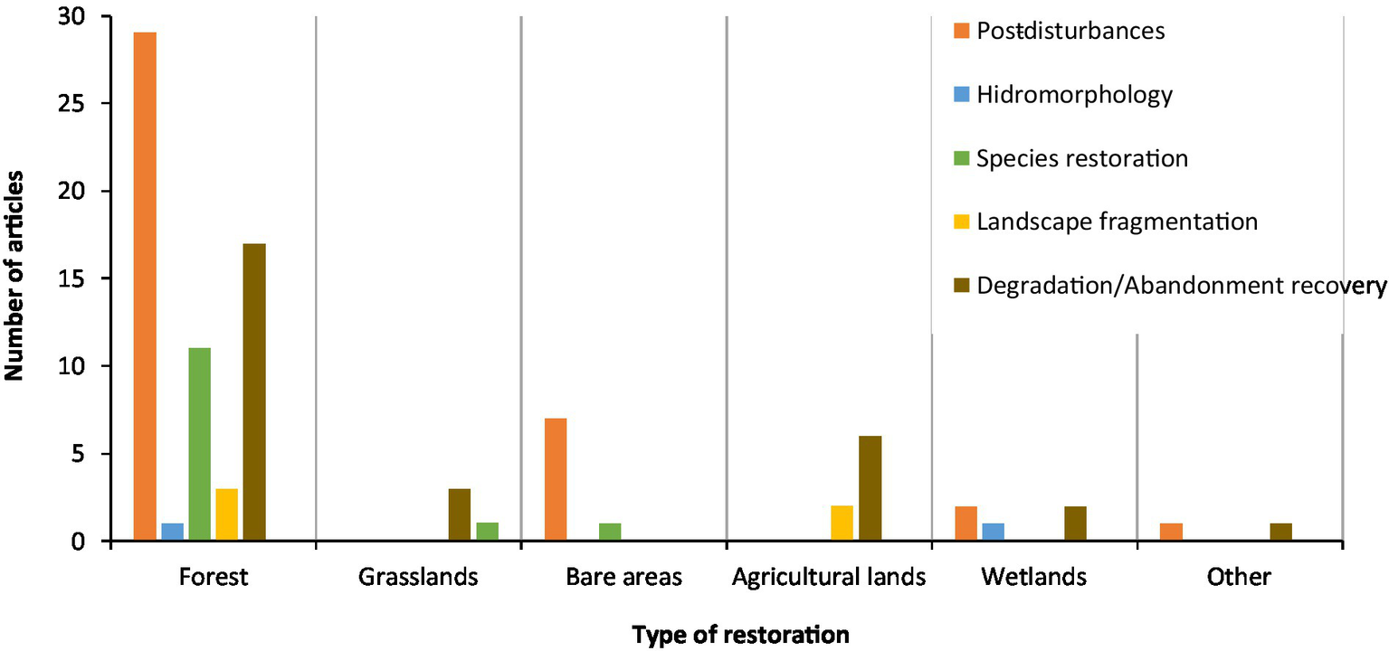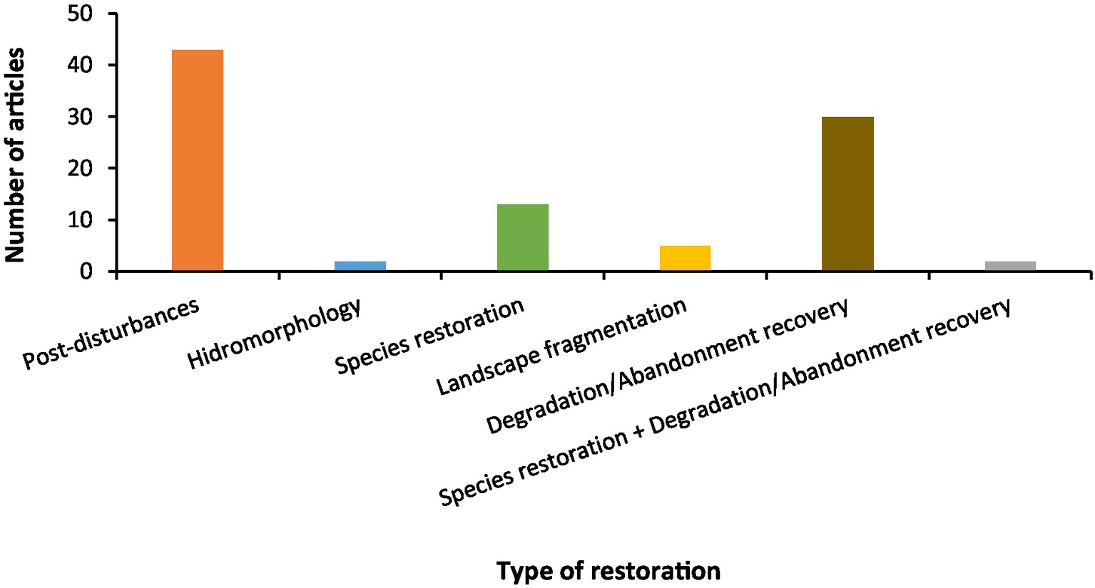 The types of restoration targets varied widely across the studies, encompassing diverse ecosystems and objectives such as reforestation, afforestation, and ecological restoration. Additionally, several studies addressed measures aimed at mitigating the negative impacts of factors like wildfires. Depending on the type of restoration implemented or evaluated in the study, we established five categories: post-disturbances such as fires, wind, storms, pests or mining; hydromorphology, species restoration (such as animals, shrubs or trees); landscape fragmentation; and degradation/abandonment recovery.