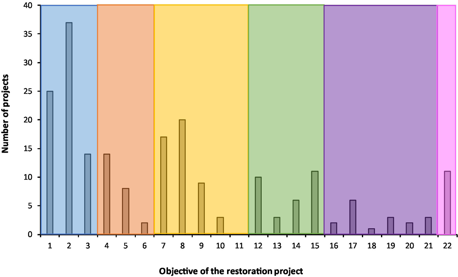 Distribution of the main objectives of the restoration initiatives in the 95 analyzed studies. Numbers on the X-axis correspond to the numbering of the objectives presented in Table 1. Colors correspond to the different ecological attributes that comprises the objectives (Table 1); blue corresponds to Species composition, orange to Structural diversity, yellow to Physical conditions, green to Ecosystem functioning, purple to Products and services, and pink to Other attributes.