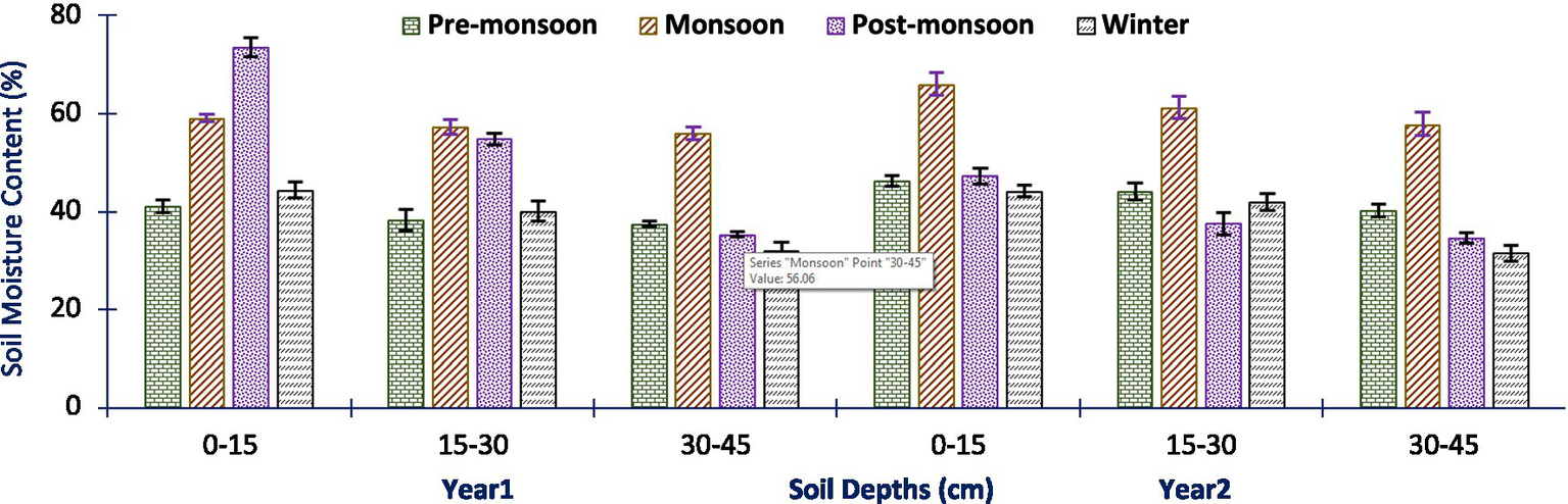 The soil moisture (Sm) data collected from different depths showed significant variability (p < 0.05). In the first year (Yr1), Sm ranged from 32.17 ± 1.02 to 73.50 ± 1.29%, and in the second year (Yr2), it ranged from 31.56 ± 1.98 to 66.06 ± 1.19% across all seasons. These results indicate that the Sm fluctuated over the study period and exhibited variations across the different seasons. The maximum Sm values were observed at a depth of 0–15 cm in the monsoons and post-monsoon season. On the other hand, the minimum Sm values were found at a depth of 30–45 cm in the winter season (Figure 3).