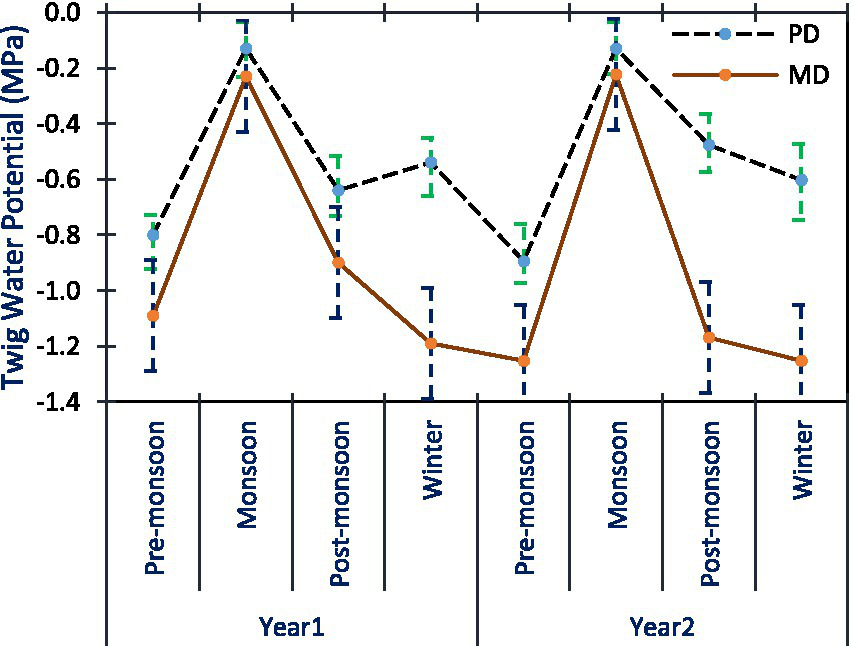Mean ΨPD and ΨMD of A. spectabilis trees twig across all the seasons. Error bars indicate ± SE.