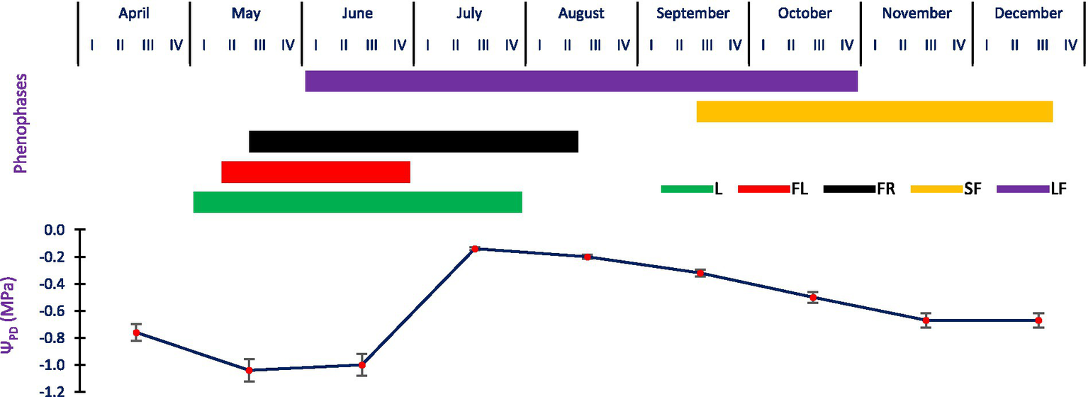 Phenological events and their relationship with ΨPD of A. spectabilis. (I-IV) weeks of each month. L = Leafing; FL = Flowering; FR = Fruiting; SF = Seed fall; LF = Leaf fall. Error bars indicate ± SE.