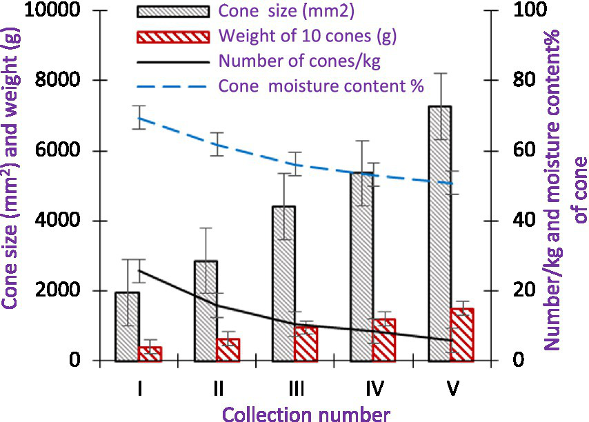 A. spectabilis cone collection began from the initiations of cones to the availability of cones in trees. Direct cone harvesting from the tree was followed by seed germination in the laboratory. Three replicates of 10 cones and 100 seeds each were used to determine the cone parameters. The parameters that were measured were the weight of 10 cones and 100 seeds as well as the number of cones and seeds per 100 g and per 10 g. “Digital vernier calipers, model numbers CD-6” accuracy +0.02 mm Mitutoyo Co. and PGB 301 accuracy +0.001 mg Wensar,” were the tools used for the size and weight parameters, respectively. For seed mass, the collected seed was dried in the air until its weight remained consistent (Harel et al., 2011). Cone and seed moisture content were calculated (International Seed Testing Association, 1981).