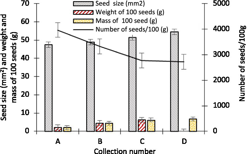 Variations in physical attributes of A. spectabilis seeds over the collection period. Error bars indicate ± SE.