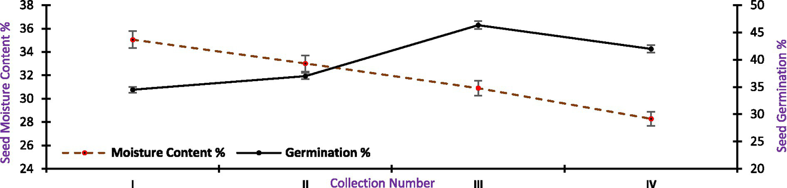 During the first collection the mean germination was 34.50 ± 1.04% which gradually increased with each collection date. The maximum germination was 46.33 ± 2.67% during the third collection after that the germination started to decline and reached 42.00 ± 2.32 at the final collection. Over the collection, the moisture content percent varied from 28.28 ± 2.41 to 35.05 ± 2.10%. The peak germination was observed when the seed moisture content was 30.90 ± 3.11%. It was observed that the seeds of A. spectabilis attained maturity in the third week of October when it showed the highest germination percentage (Figure 10).