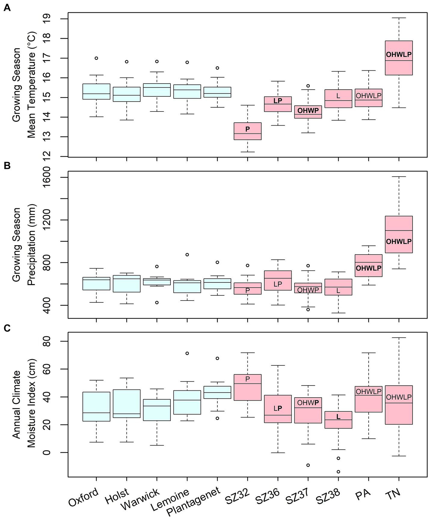 Summaries of (A) growing season mean temperature, (B) growing season precipitation, and (C) annual climate moisture index at assisted migration test sites (blue boxes) and seed origins (red boxes) used in the current study. Seed source climate values are for an historical period (1961–1990) that precedes recent rapid climate change; test site values are for the period between planting and measurement (see Table 1 for details). Letters on the seed source boxes indicate the first initial of the trial sites at which they were planted; bold letters indicate significant differences between seed source and trial site climates.