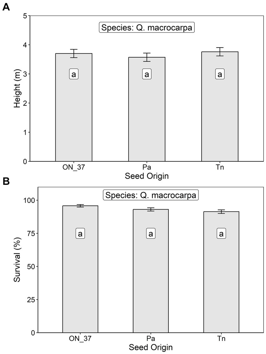 Least squares mean (A) height and (B) survival at age 12 (± S.E.) of Q. macropcarpa trees at an assisted migration trial in Oxford County, Ontario in relation to seed origin (ON_37, Ontario Seed Zone 37, Pa, Pennsylvania, and Tn, Tennessee). Differences between seed origins not sharing the same letter are statistically significant (i.e., p < 0.05).