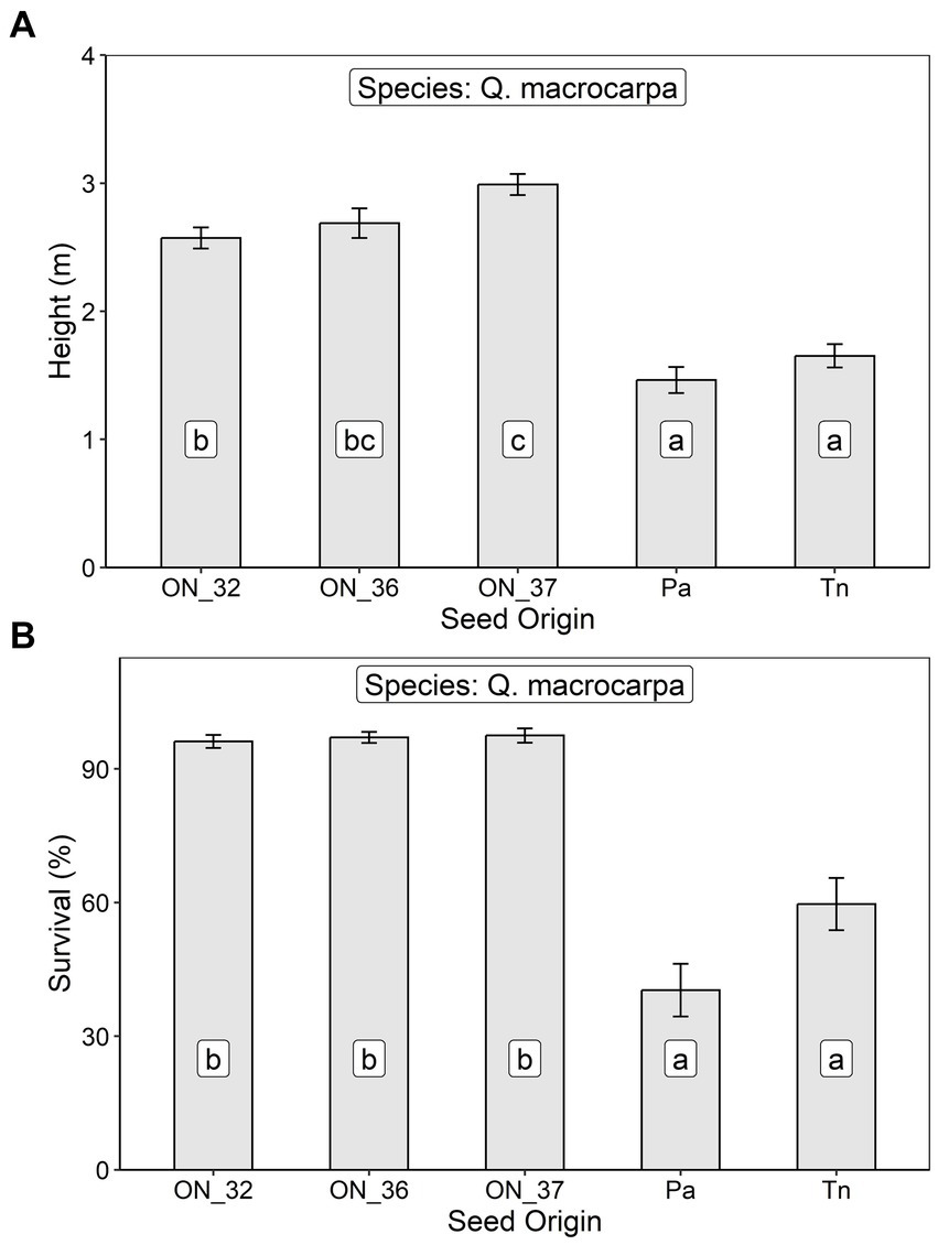 Least squares mean (A) height and (B) survival at age 8 (± S.E.) of Q. macrocarpa trees in relation to seed origin (ON_32, Ontario Seed Zone 32, ON_36, Ontario Seed Zone 36, ON_37 = Ontario Seed Zone 37, Pa, Pennsylvania, and Tn, Tennessee) at an assisted migration trial near Plantagenet, Ontario. Differences between seed origins not sharing the same letter are statistically significant (i.e., p < 0.05).