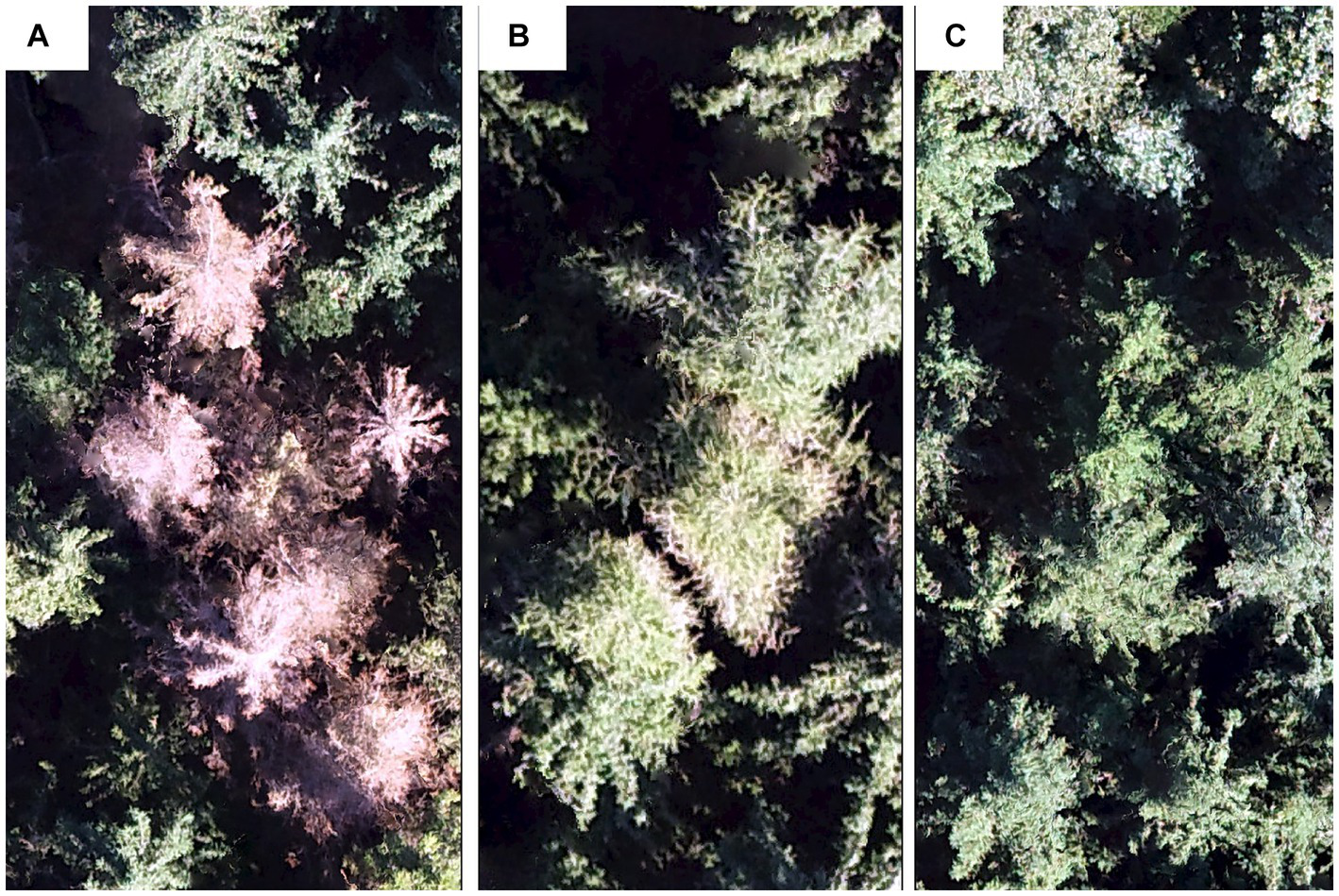 An example of the health status of the trees on the orthomosaic: (A) dead trees, (B) infested trees, (C) healthy trees.