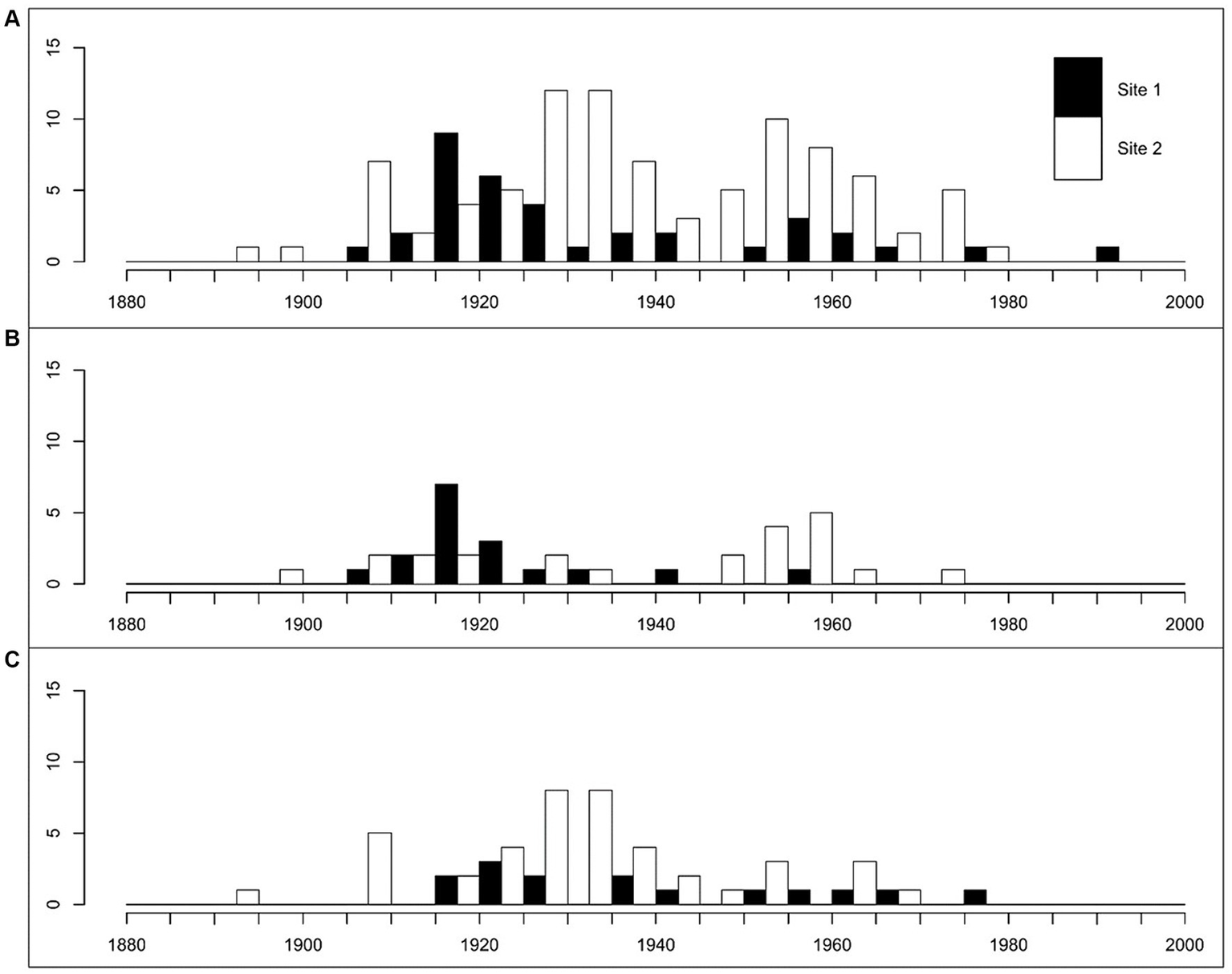 Age structure of all cored trees (A), red oak (B) and sugar maple (C) at the two study sites. Data are only accounting trees for which growth rings could be counted in whole. Trees with rotten or empty cores are not accounted for.