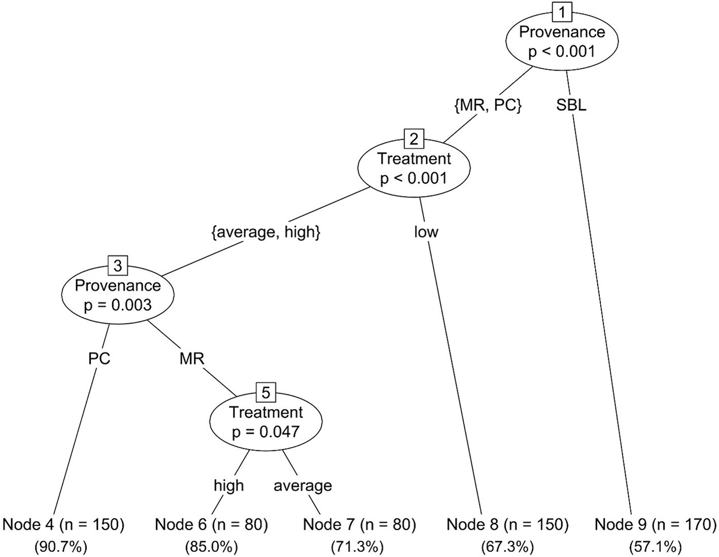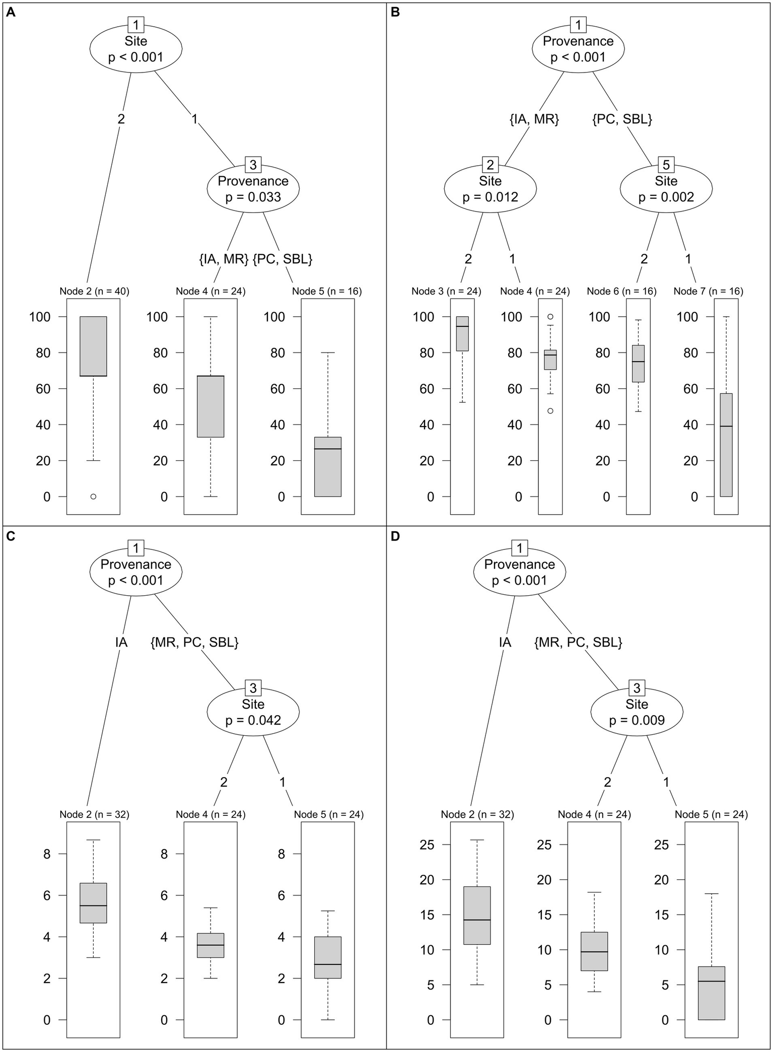 In ecology, MRT are used to describe and predict relationships between species data and environmental parameters (De’ath, 2002). In this research, the specific MRT approach that was used is the conditional inference trees variant, which is a non-parametric class of regression trees embedding tree-structured regression models into a well-defined theory of conditional inference procedures (Hothorn et al., 2006). The MRT were produced by the ctree function within the party package (Hothorn et al., 2006) in R. Other R packages used to compute results or produce graphical representations included dplyr (Wickham et al., 2020), ggplot2 (Wickham, 2016), gridExtra (Auguie, 2017), multcomp (Hothorn et al., 2008), and splines (R Core Team, 2019).
