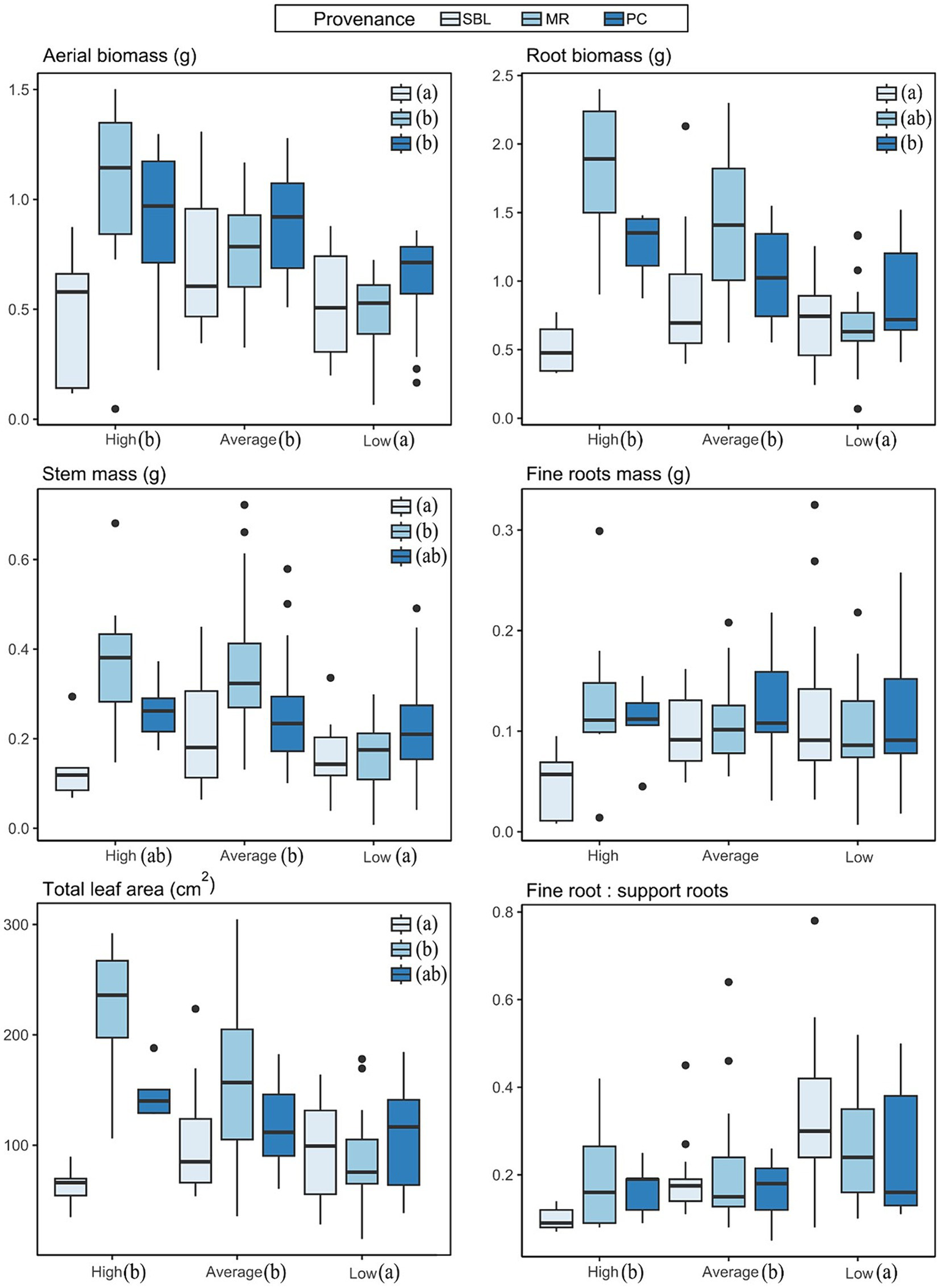 Morphological variables are presented in Supplementary material D. As a whole, the high soil richness was associated with greater height, foliar surface and leaf, stem and root mass, whereas the low soil richness treatment exhibited the lowest values. The average soil richness treatment did exhibit slightly higher stem mass than the high soil richness treatment. Root/shoot ratio were about 0.8 under low and average soil richness, while the ration was about 0.7 under high soil richness. Two-way parametric and permutational ANOVA tests suggest that total leaf area and mass as well as stem mass were significantly different among soil richness treatments, among provenances, and that there was a significant interaction between the two factors (Supplementary material E). Boxplot analysis of these variables (Figure 4) indicate that this interaction is the result of the SBL provenance. While performance of the MR and PC provenances generally increased with soil richness, the SBL provenance performed at its maximum under average soil richness and performance substantially decreased under high soil richness. ANOVA tests also suggest a significant difference in stem height between provenances, in support root mass between soil richness treatments and between provenances, and in ratio of fine roots mass/support roots mass and fine roots mass/leaf mass between treatments (Supplementary material E).