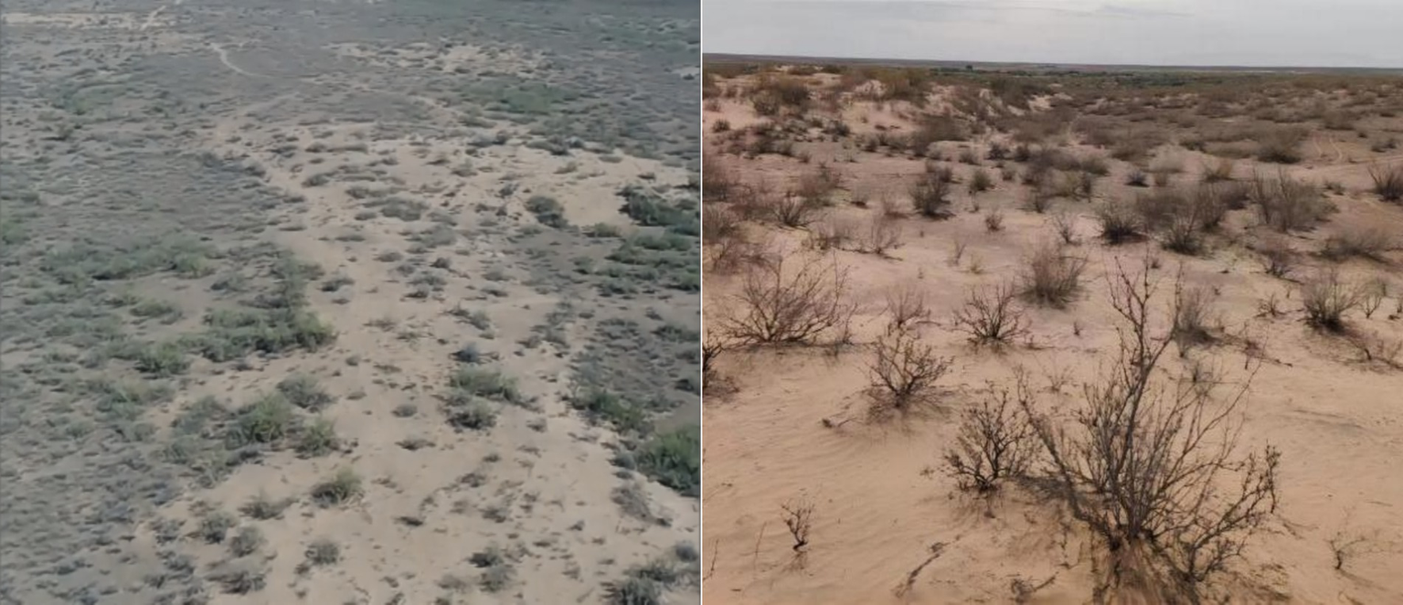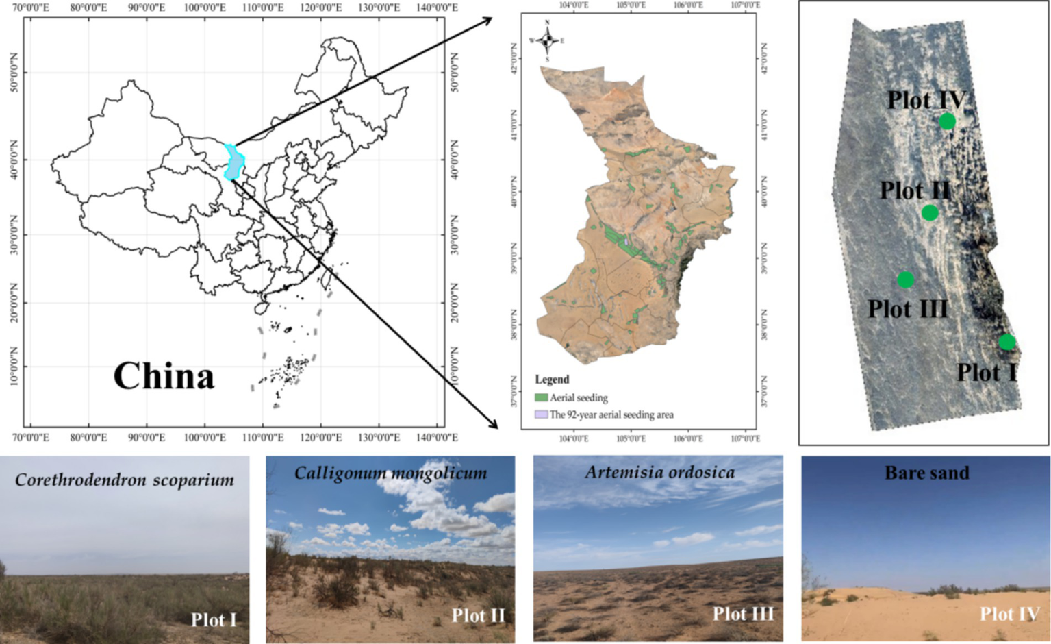 The Tengger Desert, one of China’s main dust storm source areas, is characterized by complex and variable natural conditions. The region has a dry climate, sparse vegetation, and strong wind and sand activity, making it an ecologically fragile region and a priority for wind and sand control (Gou et al., 2012). Aerial seeding afforestation, which is fast, efficient, low-cost, and covers large areas, is the most direct and effective measure for ecological restoration and vegetation reconstruction in arid desert areas with sparse populations and challenging conditions for manual afforestation (Tian et al., 2010). Since the early 1980s, large-scale aerial afforestation has been implemented on the northeastern edge of the Tengger Desert to effectively curb desert expansion. This effort has significantly increased vegetation coverage (Man et al., 2005; Qi et al., 2021). Field surveys show that after 31 years of restoration, average vegetation coverage in the aerial seeding afforestation area increased from less than 5% to over 20%. The area now features a plant community dominated by Corethrodendron scoparium, Calligonum mongolicum, and Artemisia ordosica shrubs, and the landscape has shifted from mobile dunes to fixed or semi-fixed dunes. However, the unnatural decline or even death of vegetation in some aerial seeding areas has drawn attention (Figure 1). Research indicates that in arid regions with annual rainfall between 100 and 250 mm (Tabari et al., 2012; Zhang et al., 2015), the eco-hydrological threshold for maintaining stable artificial vegetation requires sand-fixing shrub coverage between 3 and 31%. In the study area, vegetation coverage has exceeded 20%, while the average annual rainfall is only 123.33 mm. This suggests that the degradation of some vegetation could be due to insufficient soil moisture. Despite these observations, limited research has been conducted on the relationship between artificial vegetation and soil moisture in this region. Here we aim to address the following questions: What are the characteristics of soil moisture under artificial vegetation after 30 years of restoration, and how does the temporal stability of soil moisture differ between plant species? Addressing these questions is crucial for understanding soil moisture dynamics and ensuring the success of ecological restoration efforts in arid regions.