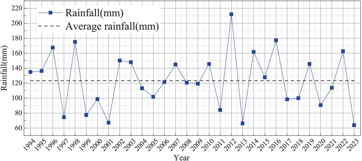 Annual average precipitation in the Alxa Left Banner from 1994 to 2023.