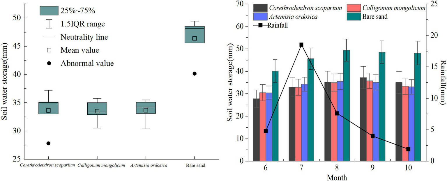 Figure 4 illustrates the variation in total soil water storage at depths of 0–200 cm during the 2023 growing season (June to October). The total soil water storage ranged from 27.81 to 47.00 mm across different plots. Specifically, the total soil water storage for was 33.64 mm for the C. scoparium plot, 33.50 mm for the C. mongolicum plot, and 33.67 mm for the A. ordosica plot, while the bare sand plot had the highest total soil water storage of 46.37 mm. During the growing season, the maximum soil water storage for the C. scoparium plot occurred in September at 37.22 mm, for the C. mongolicum plot in September at 35.76 mm, and for the A. ordosica plot in August at 35.50 mm. The bare sand plot consistently recorded higher total soil water storage compared to the other plots, reaching its maximum value in August at 49.44 mm. The soil water storage in the plots generally increased and then decreased as the months progressed. The variation in soil water storage differed among plots, as shown in the boxplots in Figure 4. The C. scoparium plot exhibited greater variation compared to the other plots, indicating moderate variability. The other plots showed weaker variation, with the A. ordosica plot having the lowest variation, though it was similar to that of the C. mongolicum plot. The variation in soil water storage was ranked as follows: C. scoparium plot > bare sand plot > C. mongolicum plot > A. ordosica plot.
