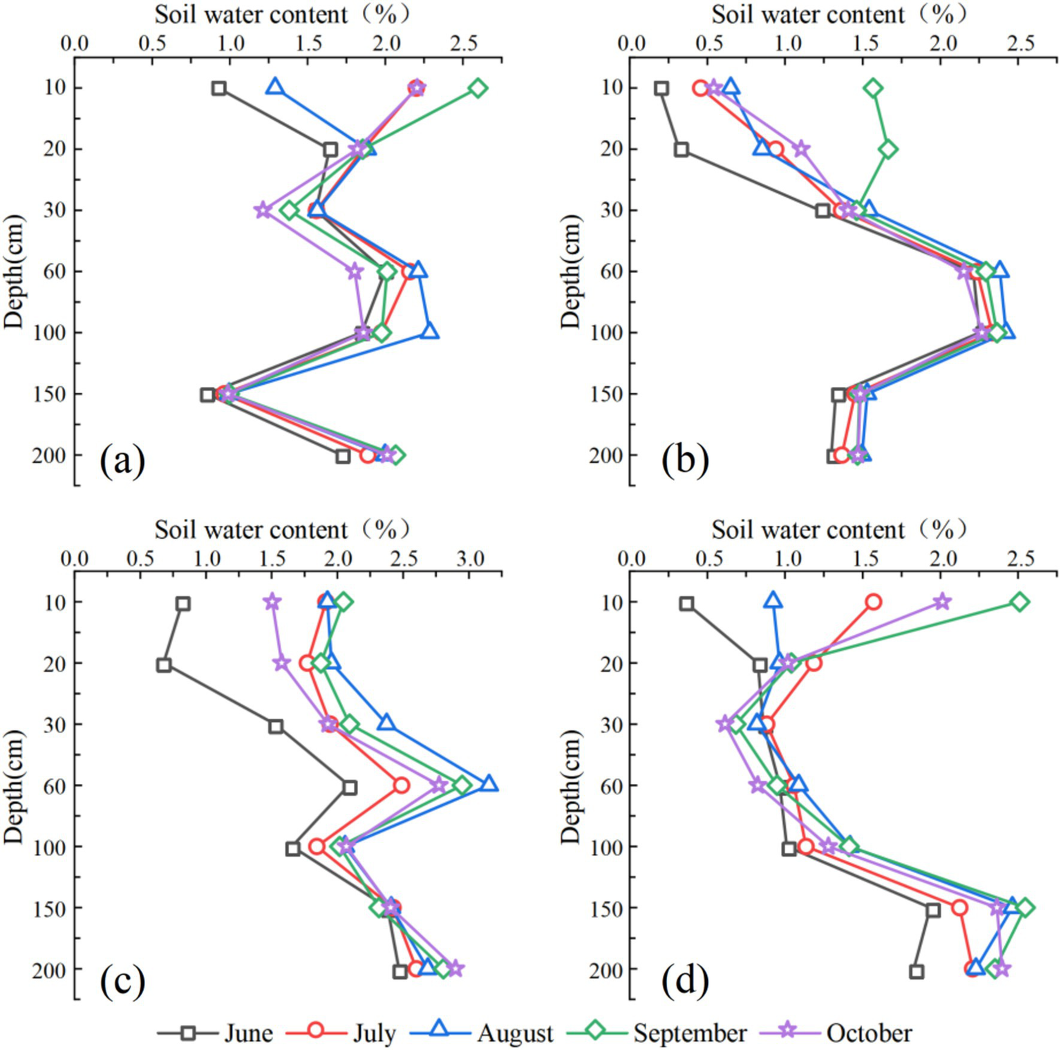Figure 5 displays the spatiotemporal characteristics of soil moisture across four plots. The soil water content in the 0–200 cm depth layer varied distinctly across different months and plots. The bare sand plot consistently had the highest average soil water content, reaching 2.13%, whereas the C. scoparium plot had the lowest average soil water content at 1.42%. The C. mongolicum plot had an average soil water content of 1.50%, and the A. ordosica plot had an average soil water content of 1.72%. Across all plots, the average soil water content increased and then decreased as the months progressed. June recorded the lowest average soil water content for all plots, with the C. scoparium plot showing the lowest value of 1.11%. The highest average soil water content of 1.66% occurred in August for the bare sand plot. During the wetter months of July and August, average soil water content increased across all plots, with the bare sand plot reaching a peak of 2.37% in August.