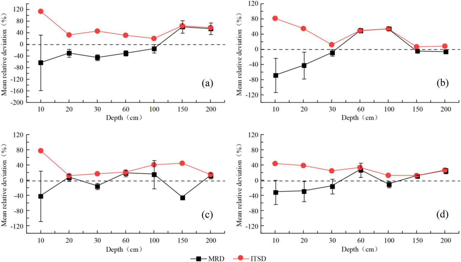 According to Zhao et al. (2010), the temporal stability index (ITSDi) is used to assess the temporal stability of soil moisture across different soil depths for various aerial-seeded vegetation types. The observation point with the highest temporal stability is identified as representing the average soil moisture condition. The calculation of ITSDi is expressed in Formula (8):