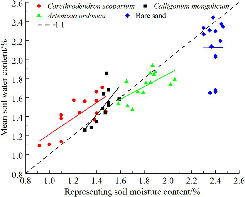 Soil moisture is the primary water source for plants in arid regions (Yao et al., 2023) and plays a critical role in the soil-vegetation-atmosphere system, as well as in hydrological, ecological, and biological processes (Liang et al., 2022; Luca et al., 1985). It is a key limiting factor in sustaining ecosystems in arid and semi-arid regions, directly influencing the carrying capacity of artificial sand-fixing vegetation systems and shaping the composition, distribution, and dynamics of regional vegetation. However, due to the challenges and costs associated with soil moisture sampling, studying spatiotemporal changes in soil moisture—particularly in natural desert environments—is difficult. Time stability analysis (Vachaud et al., 1985) is a statistical method used to describe the persistence of spatial patterns and behaviors of soil moisture over time. Soil moisture tends to exhibit spatial stability (Zhao et al., 2020), meaning certain measurement points can reliably represent the average moisture content of a region at any given time. This concept allows researchers to assess soil moisture using fewer of observation points, reducing the time and labor required compared to random sampling across numerous points (Xu et al., 2017). The study of soil moisture temporal stability has gained significant attention, with the concept being validated across various spatial scales (e.g., slope, watershed, field, and landscape) (Edivan et al., 2011; Jia et al., 2013), land use types (pasture, grassland, farmland, shrubland, and forest) (Wang et al., 2015; Zucco et al., 2014), topographic conditions (undulating terrain, gentle slopes, and complex landscapes) (Gao et al., 2019; Sur et al., 2013; Bai et al., 2021), and climatic zones (semi-arid, semi-humid, and humid regions) (Wang et al., 2013; Zhang and Shao, 2013; Xu et al., 2021).