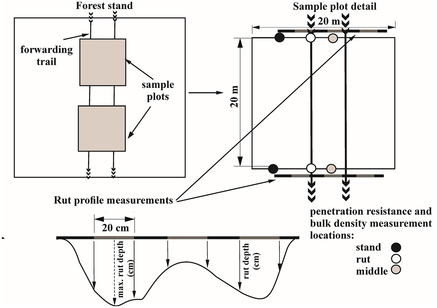 Measurement locations were established on the opposite sides of each plot (Figure 3). In each measurement location, we (i) determined the longitudinal slope with a True Pulse 360B (Laser Tech Inc., Colorado, USA) laser range finder (in °); (ii) evaluated the presence and depth of slash on the trail (cm), (iii) measured the forwarding trail profile (cm) and maximal rut depth, (iv) collected soil samples from the localities stand, rut and in the middle of the trail to determine the bulk density (BD) of soil (g cm−3) and soil moisture content (%), (v) measured soil penetration resistance (PR) in MPa and penetration depth (cm).