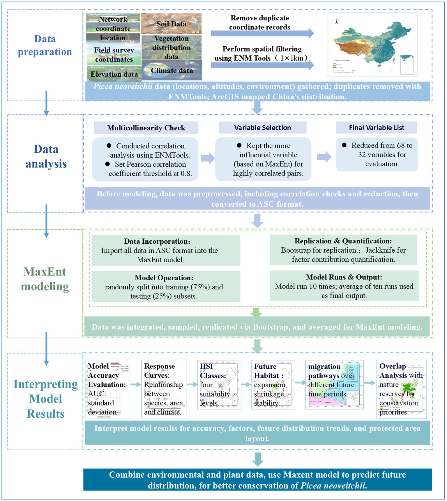 To mitigate the risk of overfitting in model predictions due to multicollinearity among environmental variables, correlation analysis was conducted using ENMTools. A Pearson correlation coefficient of 0.8 was defined as the threshold. For any two environmental factors with an absolute correlation coefficient ≥ 0.8, the one with the higher contribution rate based on the initial MaxEnt model results was retained (Supplementary Figure S2). Ultimately, 32 variables were selected from the initial 68 for evaluation purposes, as detailed in Supplementary Table S1.