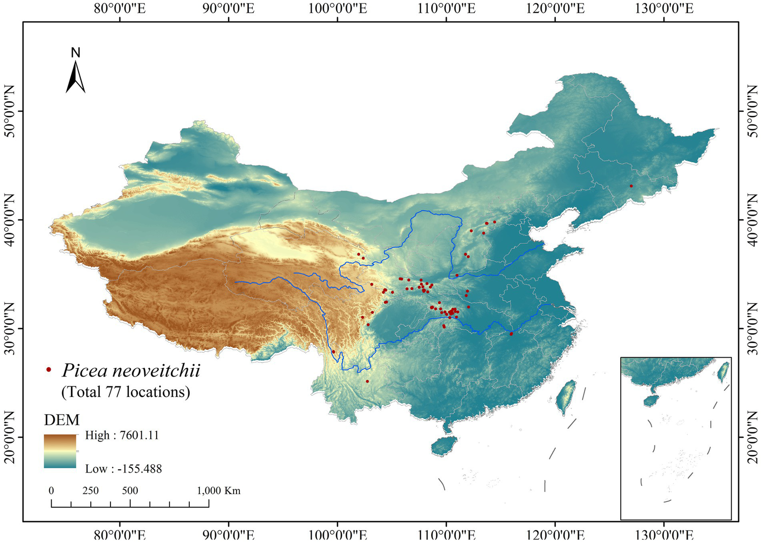 Distribution map of P. neoveitchii in China.