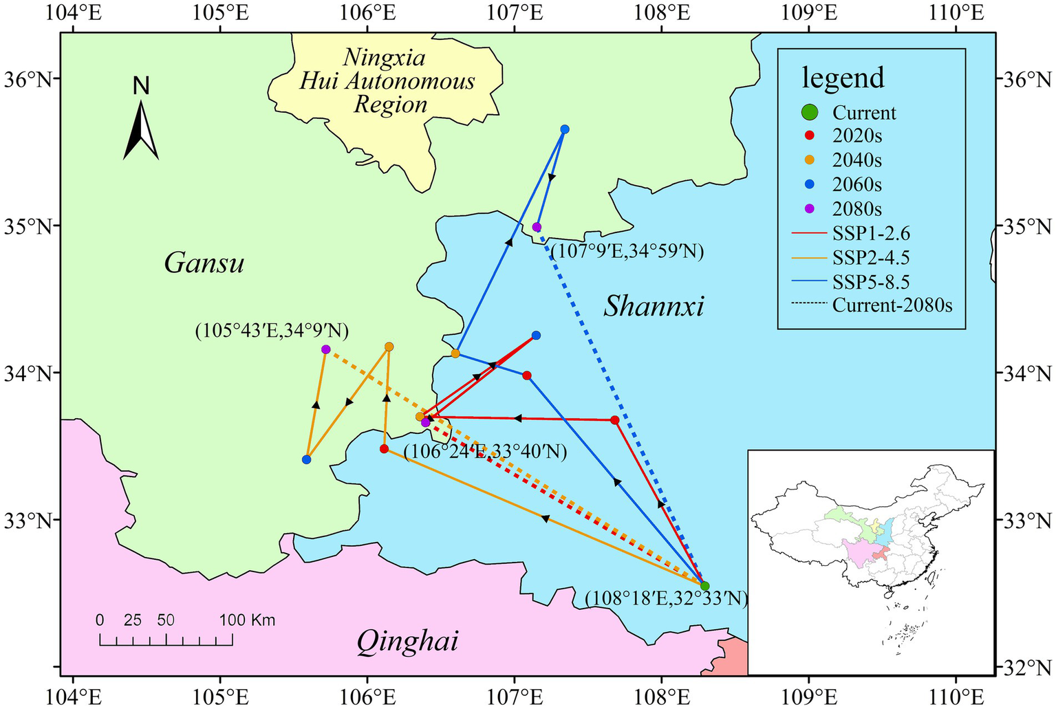 Currently, the centroid of P. neoveitchii distribution is situated in Ziyang County, Ankang City, Shaanxi Province, China (108°18′E, 32°33′N). Predictions under three distinct climate scenarios indicate that by 2080–2,100, the centroid’s migration trend predominantly leans northwestward, albeit with scenario-specific variations in path and distance. Specifically, under SSP1-2.6, the centroid is projected to relocate to Huixian County, Longnan City, Gansu Province (106°24′E, 33°40′N), approximately 215 km from its current position. In SSP2-4.5, the migration path is basically the same as in SSP1-2.6, but extends further, concluding in Huixian County, Longnan City, Gansu Province (105°43′E, 34°9′N), about 300 km away. SSP5-8.5 forecasts a more significant northward shift, settling in Lingtai County, Pingliang City, Gansu Province (107°9′E, 34°59′N), approximately 290 km distant from the current position (Figure 7). Furthermore, the importance of geographical variability, particularly in relation to conservation efforts at higher altitudes, is underscored by the observed migration trends of P. neoveitchii. As temperatures rise, the species is projected to migrate further towards higher latitudes and altitudes, seeking cooler environments. This migration towards higher altitudes not only highlights the species’ adaptive capacity but also poses significant conservation challenges. Effective conservation strategies must consider the shifting habitat requirements of P. neoveitchii and prioritize the protection of habitats at higher altitudes, which are likely to become crucial refuge areas under future climate scenarios.