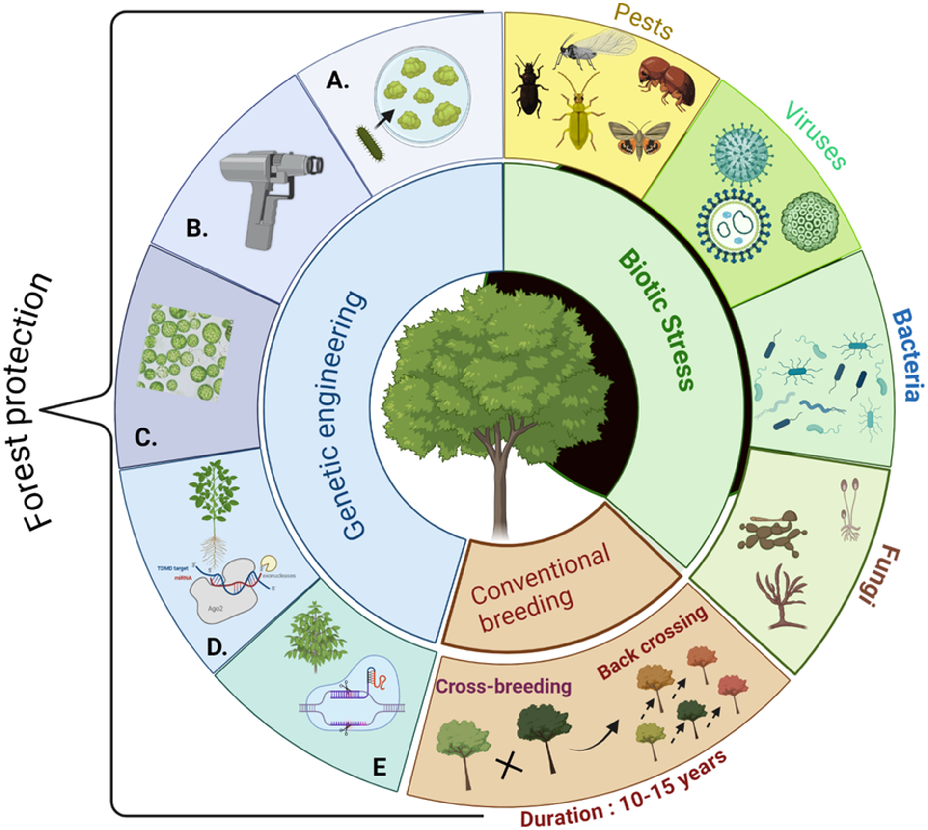 Summarizing forest protection using genetic engineering. Increasing biotic stressors (i.e., pests and pathogens) cause dramatic tree mortality in the forests worldwide. The conventional breeding method is time-consuming and fails to cope with the demands. Transgenic pest and disease resistance trees (i.e., Poplar) can potentially mitigate the challenges. Transgenic trees can be generated using various transformation techniques such as (A) agrobacterium-mediated transformation, (B) gene-gun mediated transformation, (C) protoplast-mediated transformation, (D) mi-RNA or RNAi-mediated transformation, and (E) CRISPR-mediated transformation techniques. (The figure is prepared using biorender.com).