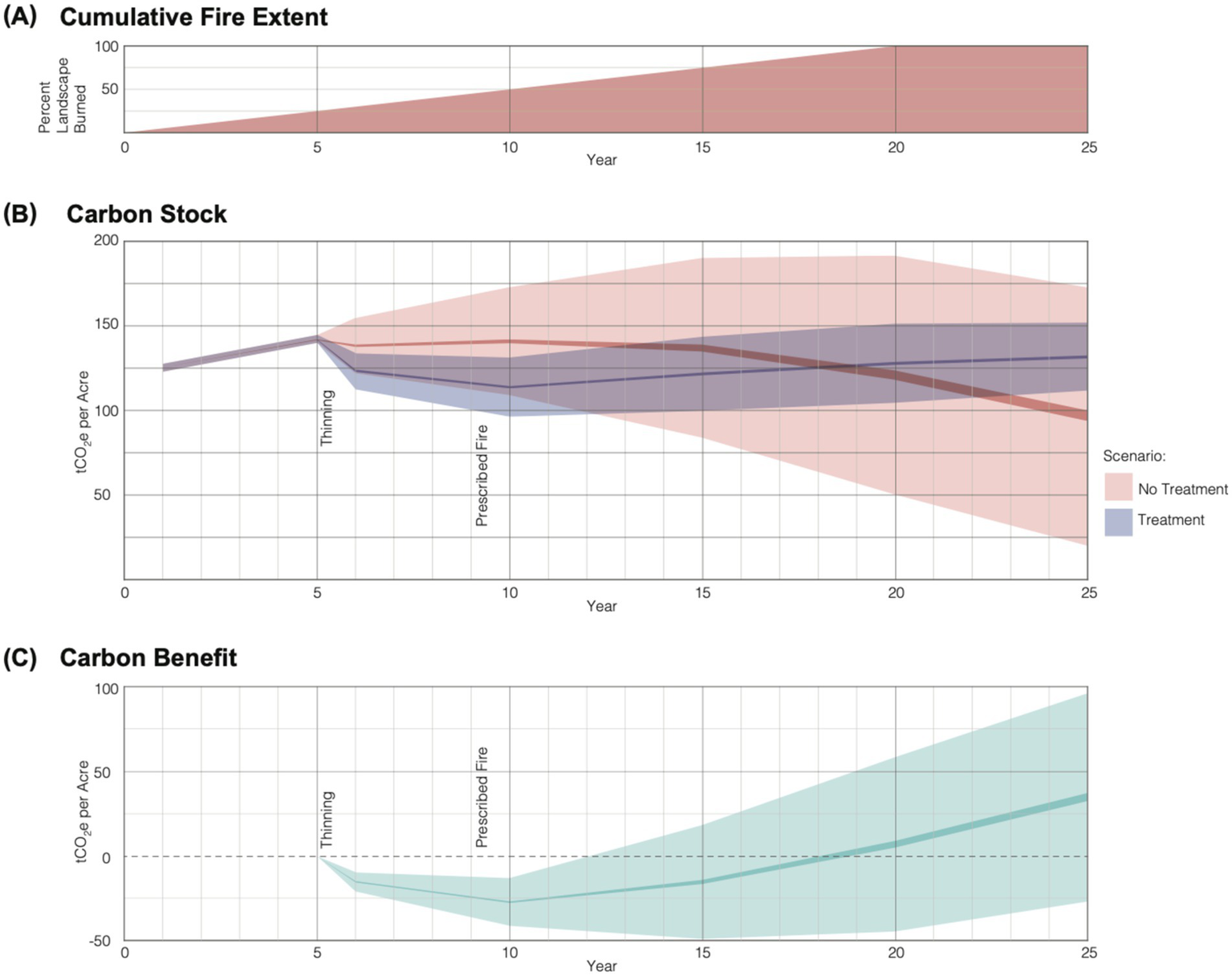 Panel (A) shows the cumulative probability of fire extent over time for treated and untreated scenarios, indicating the increasing likelihood of landscape burning as time progresses. The cumulative probability reflects the proportion of the landscape expected to burn by any given year, based on recent fire extents. Panel (B) illustrates changes in aboveground live carbon (tCO2e per acre) over 25 years for treated and untreated scenarios, with thinning and prescribed burning marked. Variability in carbon outcomes is based on Monte Carlo simulations using fire data from 2010 to 2020 across the 2,860,418-acre reference region, with fire extents ranging from 0.05 to 14.86% and an average of 5.12% annually. Lighter shaded regions represent one standard deviation from the mean (per-acre variability), while darker shaded regions represent the standard error around the mean (landscape-level variability). Panel (C) displays the carbon benefit (tCO2e in living biomass per acre) from treatment over time, showing the difference in carbon storage between treated and untreated scenarios. Lighter shading indicates variability in individual acre benefits, while darker shading represents the average landscape-scale benefit. After 25 years, the mean per-acre carbon storage in the treatment scenario is 35 tCO2e higher than in the no-treatment scenario.