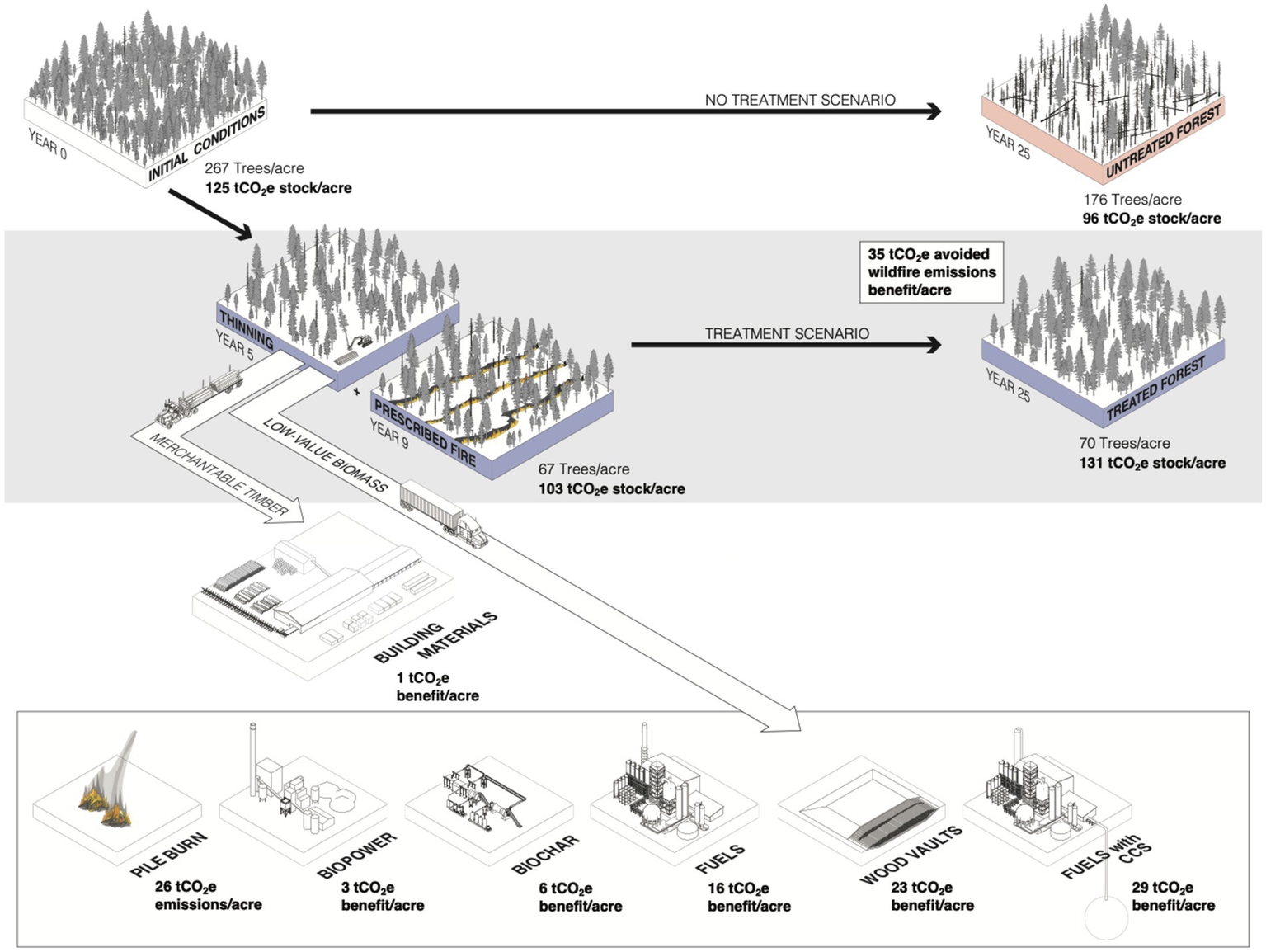 Comparison of trees per acre and aboveground carbon stocks for treatment and no-treatment scenarios. The treatment scenario, which includes thinning in year 5 and prescribed fire in year 9, results in 35 tCO2e higher carbon storage by the end of the simulation. Carbon benefits from various biomass utilization pathways—including merchantable timber, pile burning, biopower, biochar, biomass burial, fuels, and fuels with CCS—are shown for an average acre, which yields 14.3 BDT of low-value biomass and 10.2 MBF of merchantable timber.