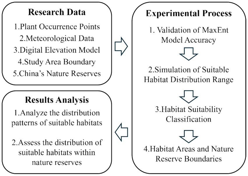Species Distribution Models (SDMs) are tools that combine species’ spatial locations with environmental factor information to identify the relationship between species distribution patterns and environmental variables, and further simulate the potential distribution of species (Melo-Merino et al., 2020; Lee-Yaw et al., 2022; Chauvier et al., 2022). These models calculate the probability of species occurrence in space, which can be used to represent species’ adaptability to the environment (Li et al., 2020). The results can be extended to indicate the suitability of species’ habitats (Xu et al., 2019; Zhao et al., 2021). Common SDMs include the Biomod2 Model and the GARP Model (Genetic Algorithm for Rule-set Production). The Biomod2 model integrates multiple algorithms to comprehensively predict species distribution but requires high-quality data (Hao et al., 2019). The GARP model, based on genetic algorithms, has good adaptability and predictive power, although it may have limitations when dealing with complex environmental factors (Townsend Peterson et al., 2007) MaxEnt (Maximum Entropy) is one of the most widely used models in SDMs (West et al., 2016; Yan et al., 2020; Zhang et al., 2021; Khan et al., 2022; Tang et al., 2021; Fitzgibbon et al., 2022). Its advantages lie in its ability to achieve accurate simulation and prediction even when spatial distribution data for species is limited and the relationships between environmental factors are unclear (Gebrewahid et al., 2020; Jose V and Nameer, 2020) MaxEnt has demonstrated strong predictive capabilities in studies related to establishing nature reserves, predicting the potential habitat of invasive species, and assessing the impact of climate change on species (Elith et al., 2006; Gebrewahid et al., 2020; Jose V and Nameer, 2020; Yi et al., 2016). Compared to other models, MaxEnt constructs the spatial distribution model of target species by calculating the probability distribution in the state of maximum entropy. This method is advantageous because it can make more efficient use of limited data, thereby improving the accuracy and reliability of predictions.